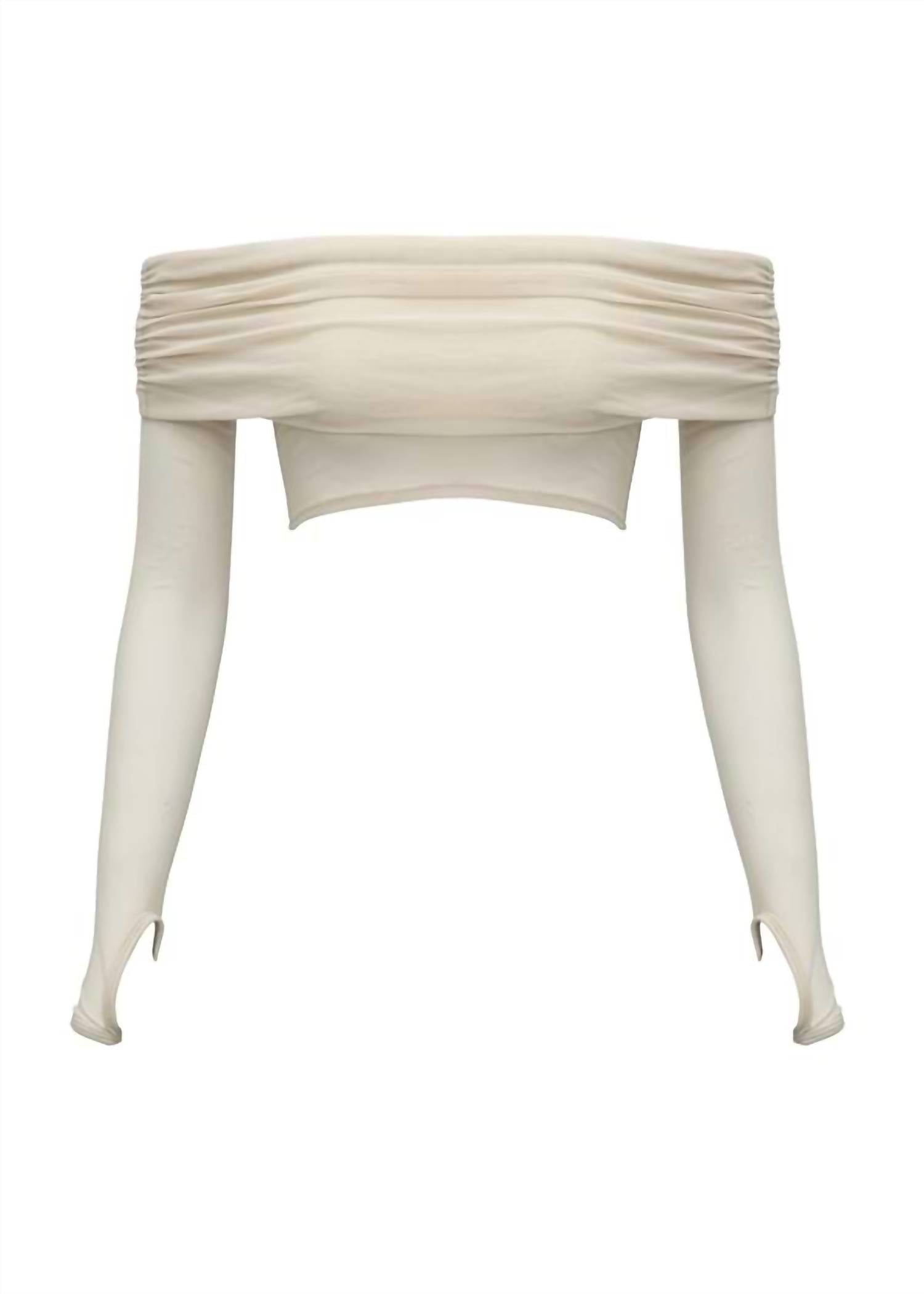 Show a little skin in this cute and casual crop top. The Lena Off-the-Shoulder Shirt by Bananhot is a chic addition to your spring wardrobe, ideal for that boho chic vacation vibe. Featuring a flattering off-the-shoulder neckline and long sleeves, this crop top is crafted from a soft and stretchy blend of 83% polyester and 17% elastane in a stylish macadamia color. This solid-patterned top offers a feminine touch without pockets, and it's designed to be easily slipped on with a pull-on closure. Care is simple with machine wash instructions, making it perfect for effortless elegance.