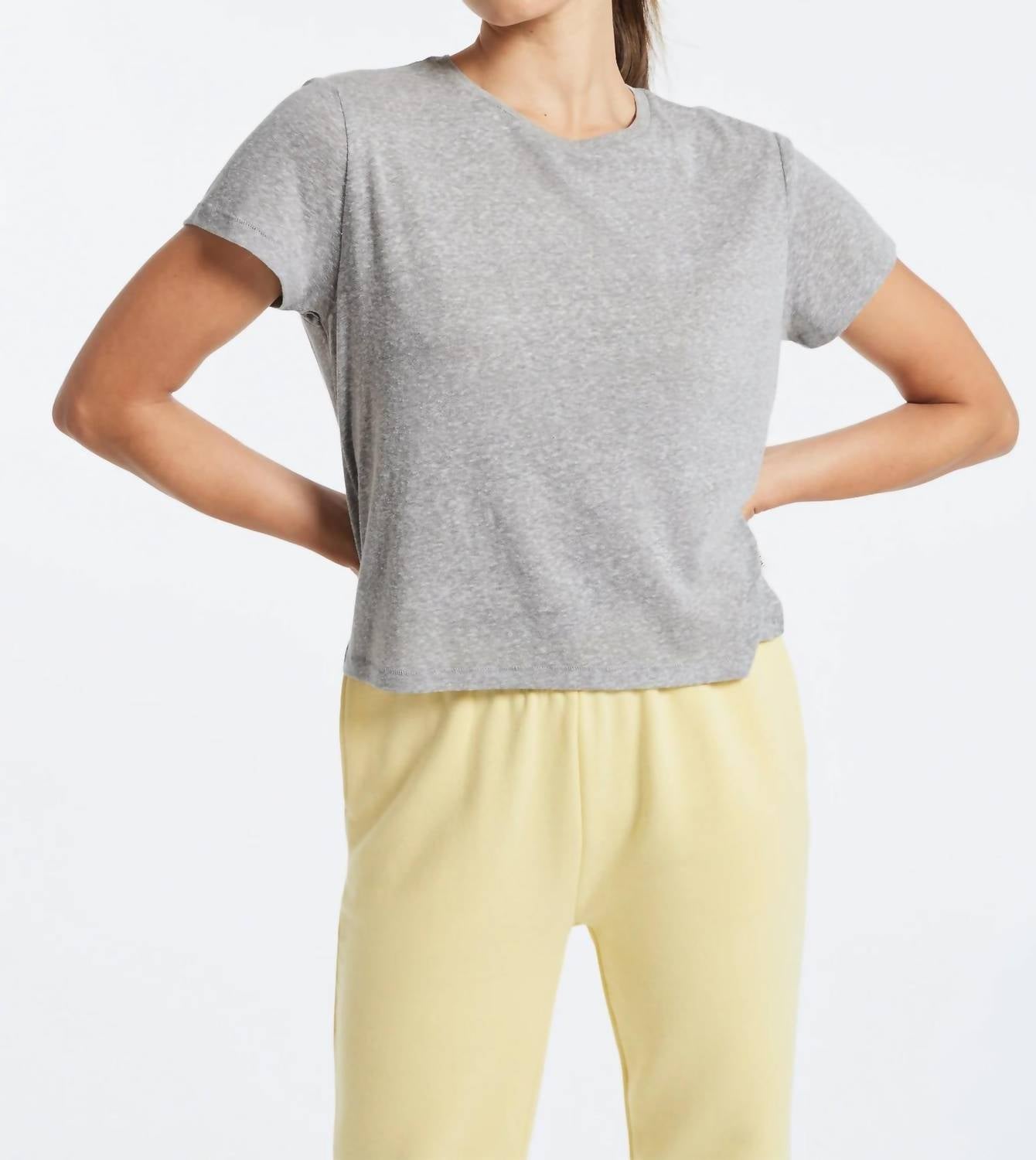 The short sleeve tee you'll want in every color. Upgrade your casual wardrobe with the Bowery Boxy Tri-blend Tee by BANDIER, a must-have for minimalist style in Heather Grey. This short sleeve tee features a solid pattern and a classic crewneck, perfect for effortless summer dressing. The tee is designed with a pull-on closure and is easy to care for with machine wash instructions. Ideal for both relaxed occasions and holiday parties.