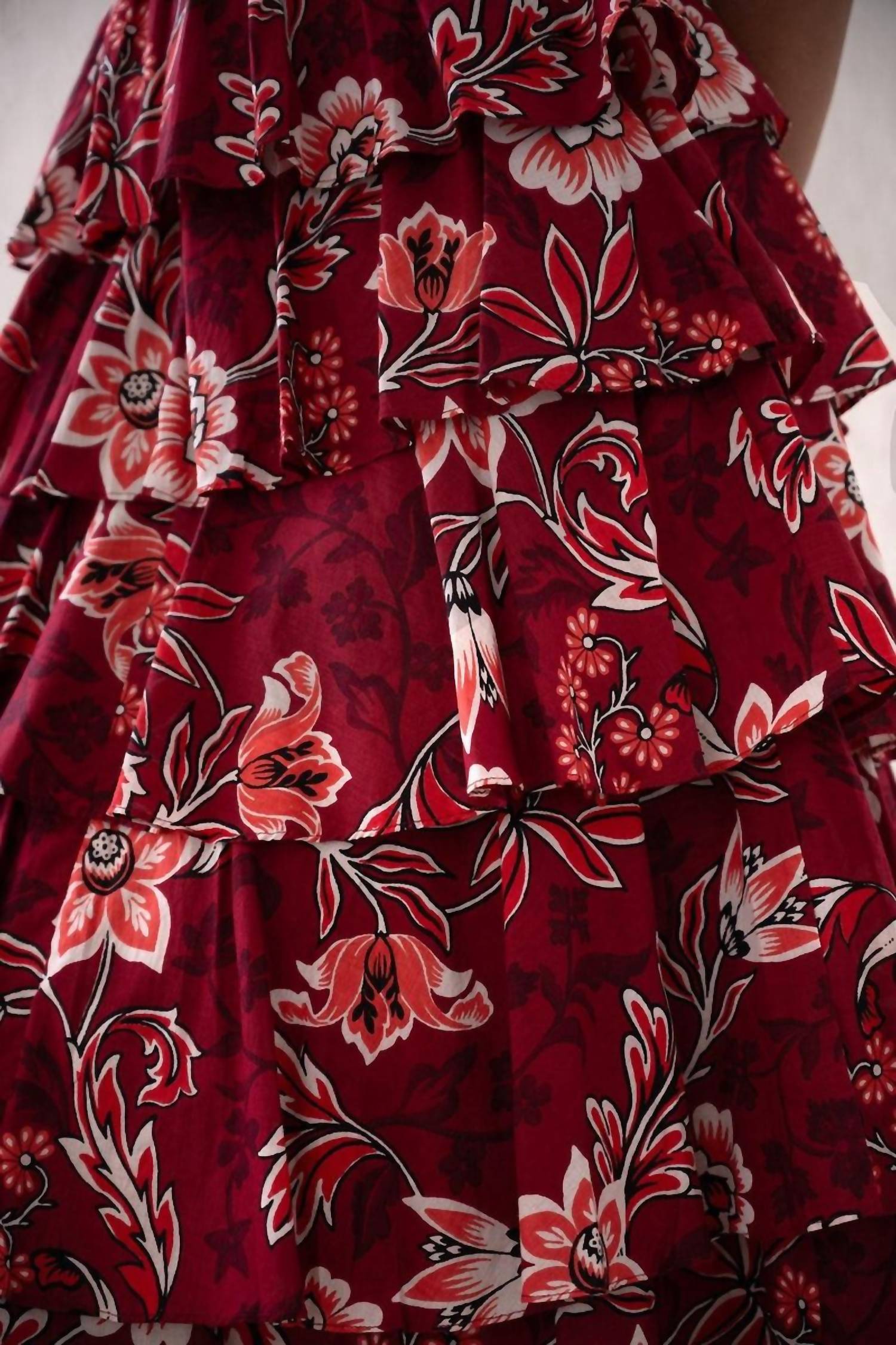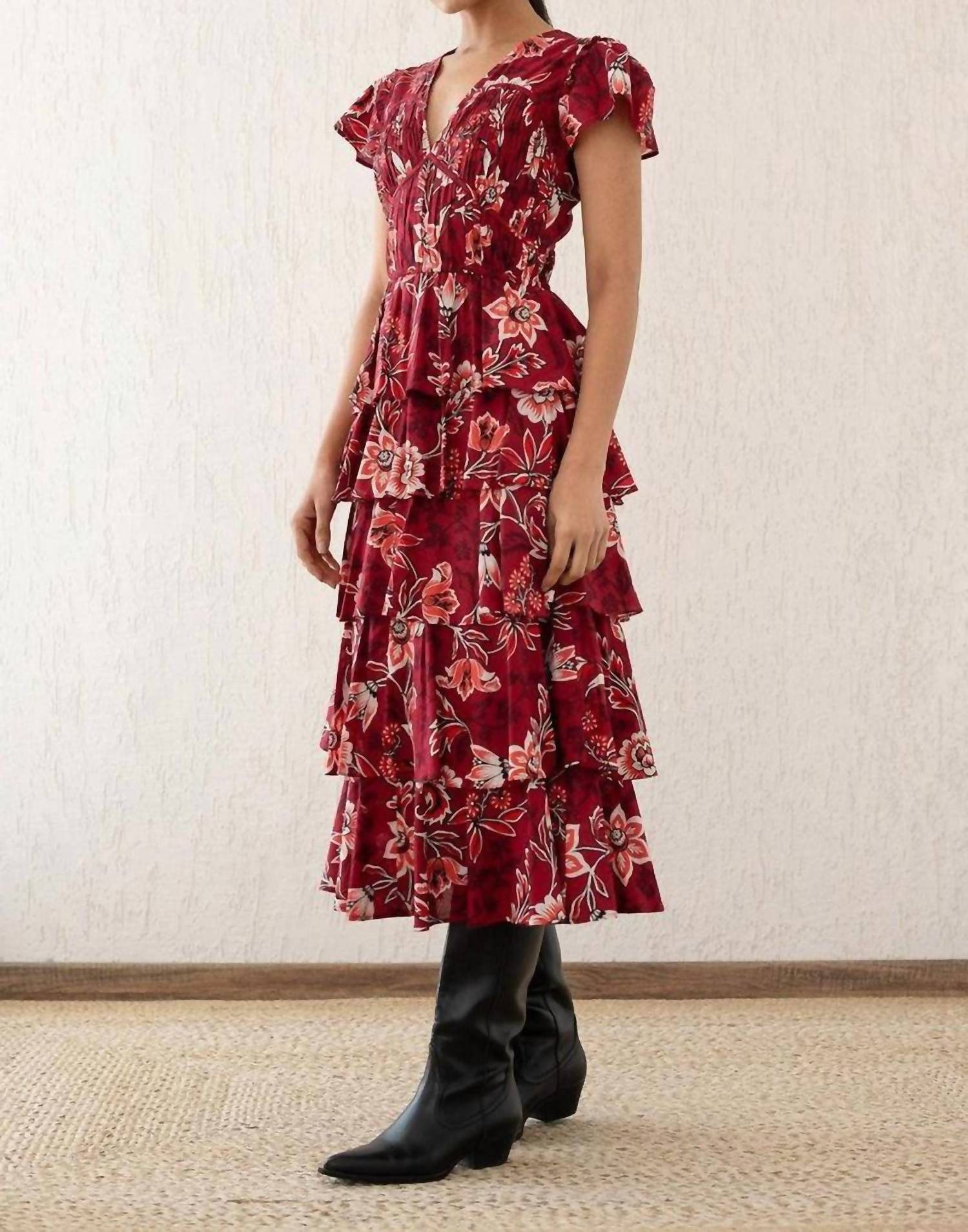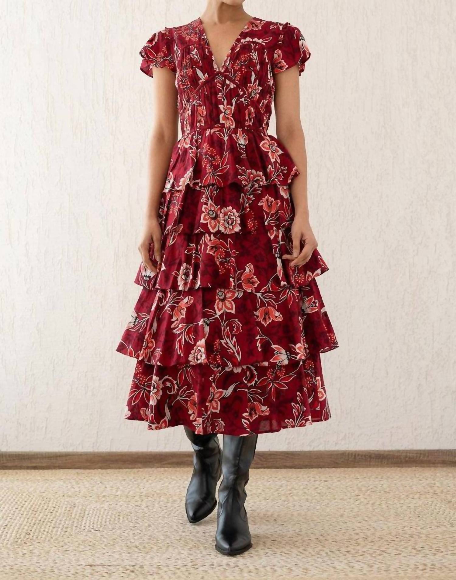 A midi dress so versatile, your options for wearing it are endless. Embrace boho chic elegance. Crafted in India with 100% Cotton Cambric for a breathable fit. Fit and flare midi dress features short sleeves and a flattering V-neckline, perfect for a dinner party this spring. Showcasing the timeless Elisabetta Vine Rio floral pattern, designed with a cascading skirt of tiered ruffles, evoking 19th-century Viennese romance. Easy to wear with a pull-on closure. Convenient care, simply machine wash cold and line dry. Model is 5'10'' and wearing a size S.