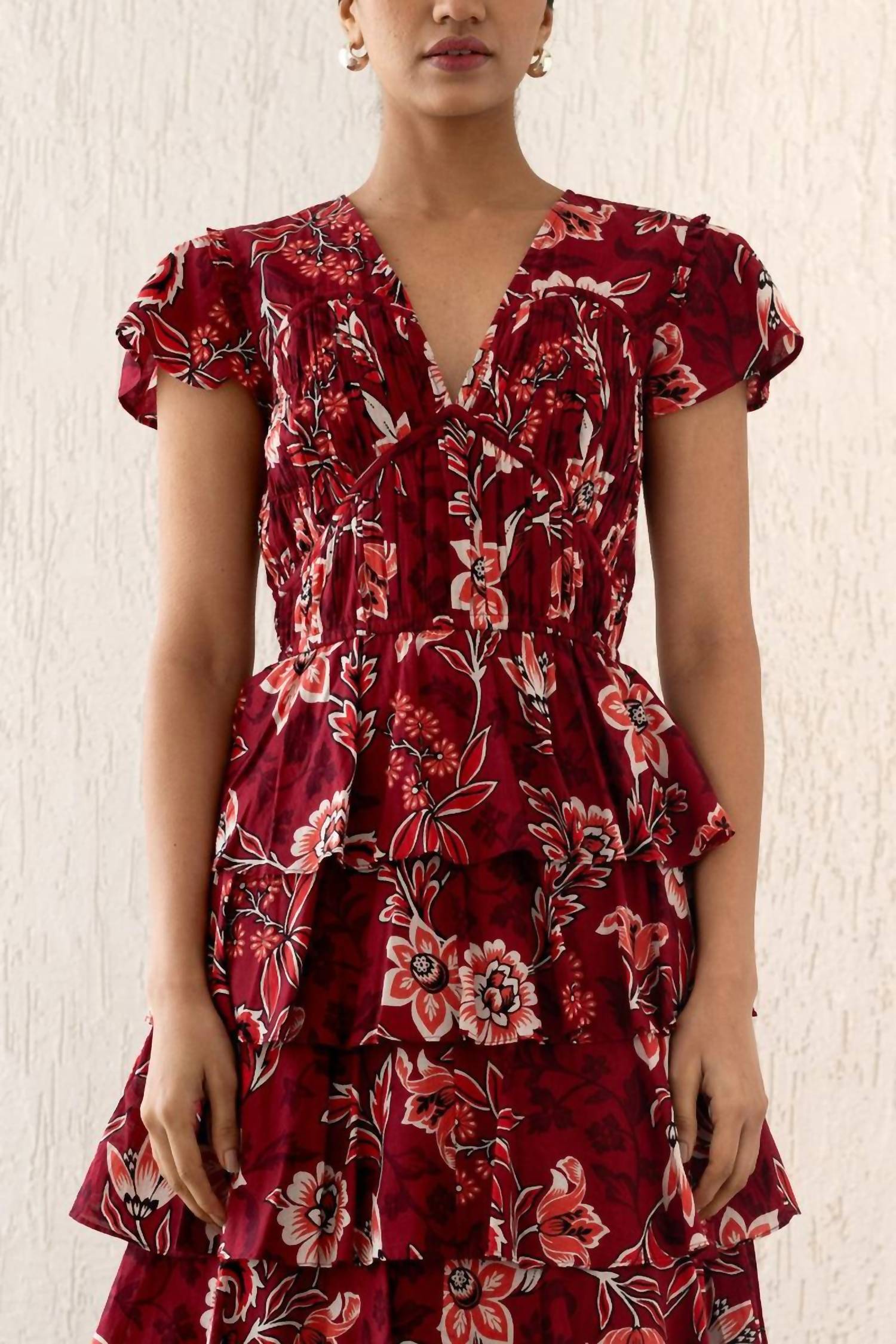 Embrace boho chic elegance. Crafted in India with 100% Cotton Cambric for a breathable fit. Fit and flare midi dress features short sleeves and a flattering V-neckline, perfect for a dinner party this spring. Showcasing the timeless Elisabetta Vine Rio floral pattern, designed with a cascading skirt of tiered ruffles, evoking 19th-century Viennese romance. Easy to wear with a pull-on closure. Convenient care, simply machine wash cold and line dry. Model is 5'10'' and wearing a size S.