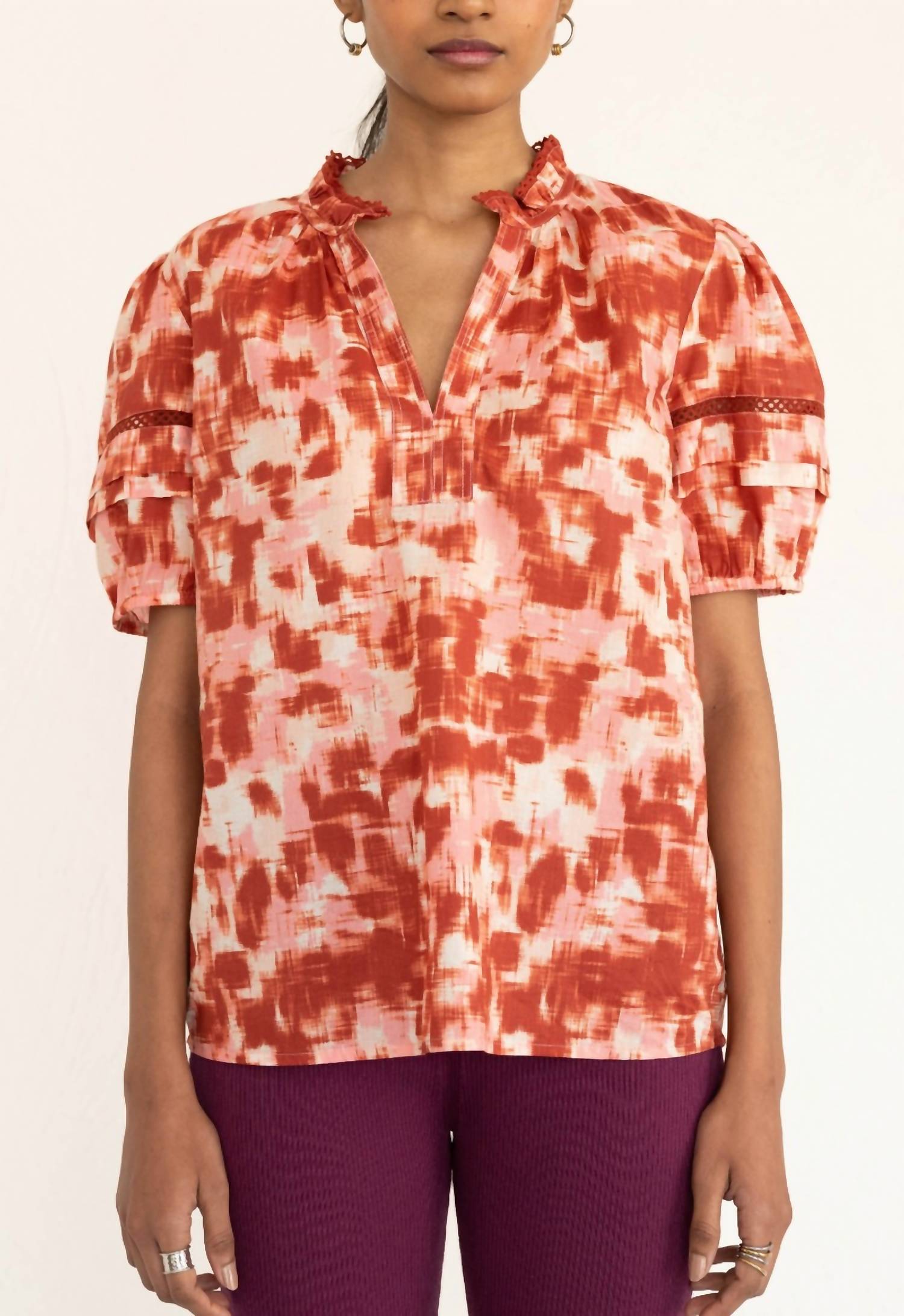 Pair this with your favorite jeans and slides for your next girls night out. The Bronte top is an easy-wearing pullover with a front opening and delicate detailing at the neck. Finished with charming pleats on the sleeves, this top balances comfort and style. V-neckline with a ruffled, standing collar. Puff sleeves that end above the elbow. Lace trim detailing on the sleeves. Relaxed fit through the body.