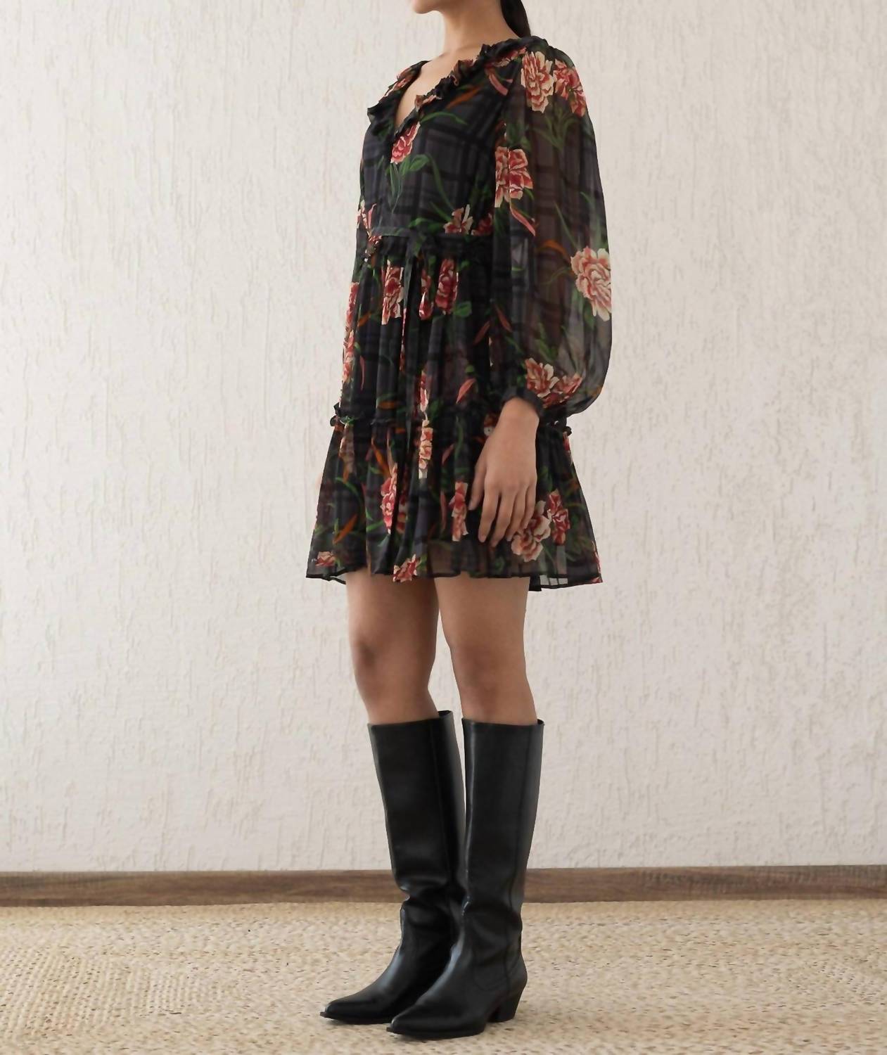 Embrace sophistication in the Florence Long Sleeve Dress by BANJANAN, tailored for every festive occasion. Crafted from exquisite viscose chiffon, this women's mini dress features long sleeves and an A-line silhouette with a tiered skirt adorned with ruffle trims. In meteorite black/red floral print, the V-neckline and belted waist accentuate your figure beautifully. Closure: Pull on. Care: Machine wash. Perfect for a boho-chic look at any holiday party or New Year's Eve celebration.