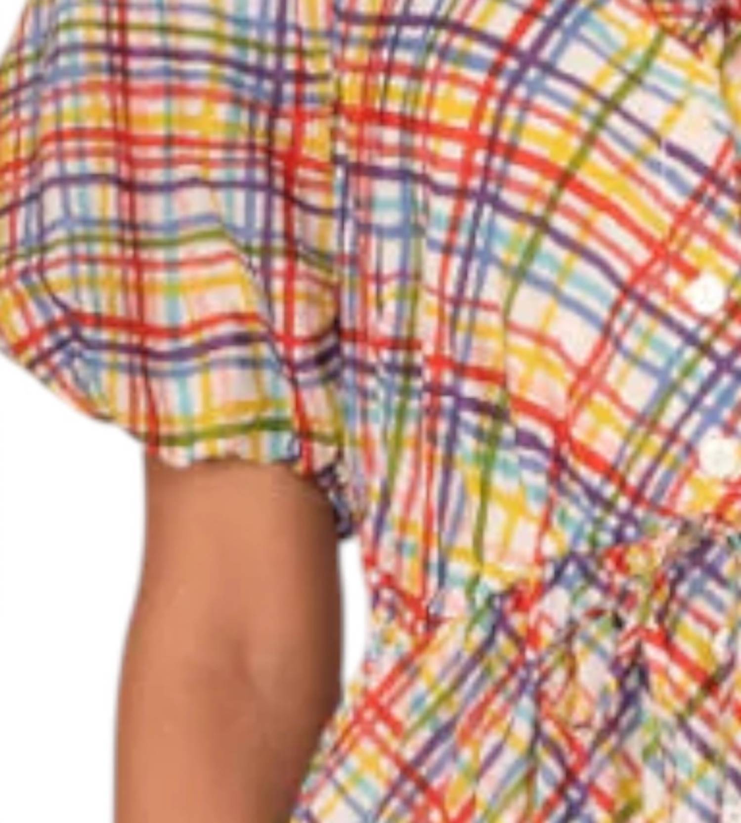 Introducing the Poppy Midi Dress by BANJANAN, a vibrant celebration of traditional European handcraft, now available in Rainbow Hibiscus. Designed with short raglan sleeves and composed of soft cotton, this A-line dress is perfect for spring holiday parties. It features a V-neck with a partial button closure, a convenient drawstring waist, and practical side pockets. Care for this patterned, maximalist piece by machine washing it, ensuring a lasting addition to your wardrobe.