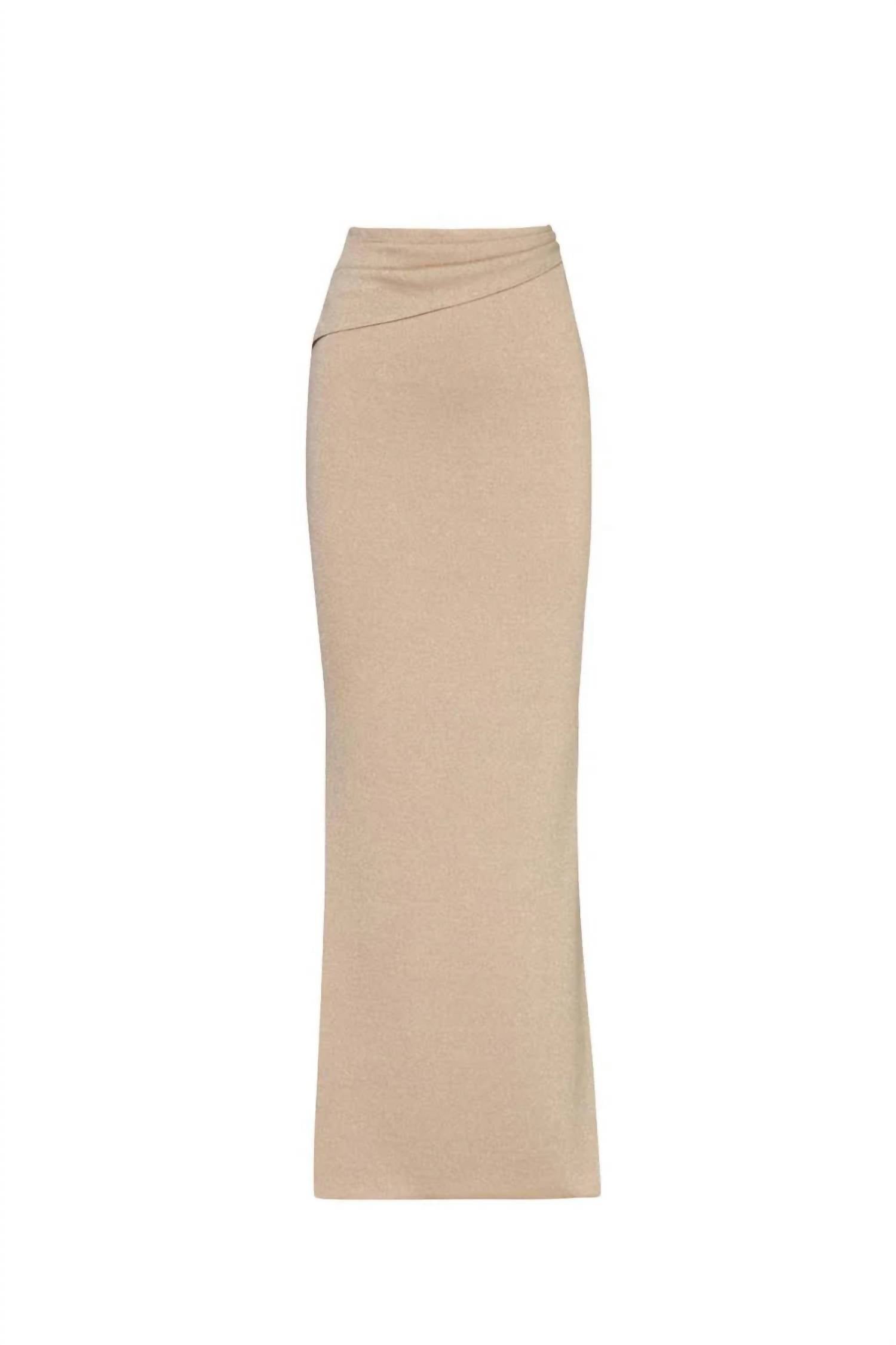 Introducing the Amber Skirt Set by BAOBAB, expertly crafted in a chic beige hue, perfect for your monochrome summer wardrobe. This elegant ensemble features a top with long sleeves, showcasing a high neckline, pleated fabric, ruched accents, and stylish slits paired with Baobab-inspired side details. The matching maxi skirt is designed with a high waist for a flattering silhouette. Composition includes a blend of rayon, polyamide, metallic fiber, and elastane, complemented by a comfortable polyester-spandex lining. Closure: Pull-on style. Care: Dry clean only.