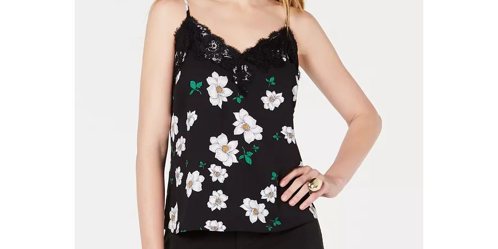 Camisola feminina Bar III com estampa floral e acabamento em renda, preta, tamanho pequeno
