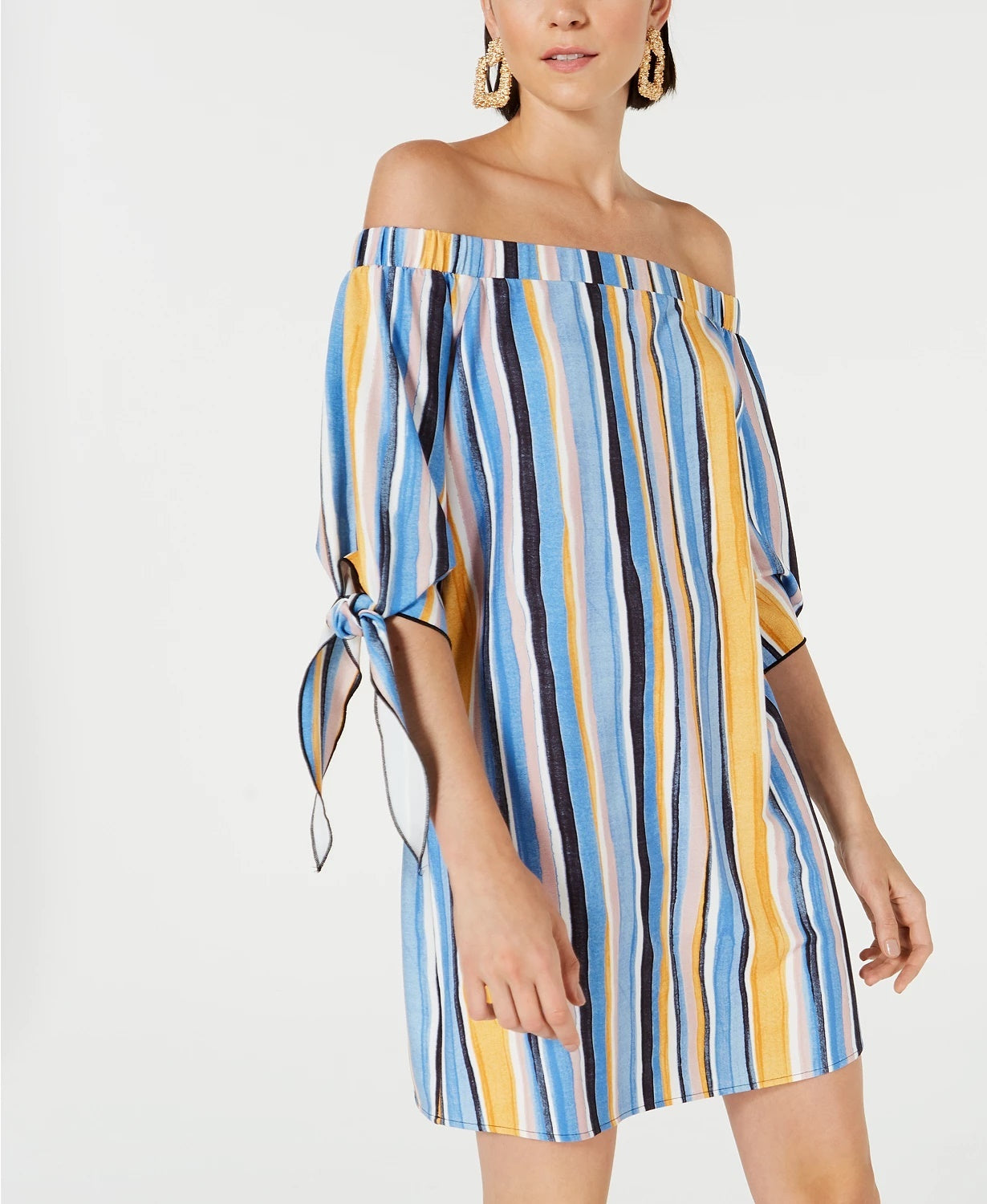 Vestido feminino Bar III com decote ombro a ombro e manga amarrada, azul, tamanho pequeno