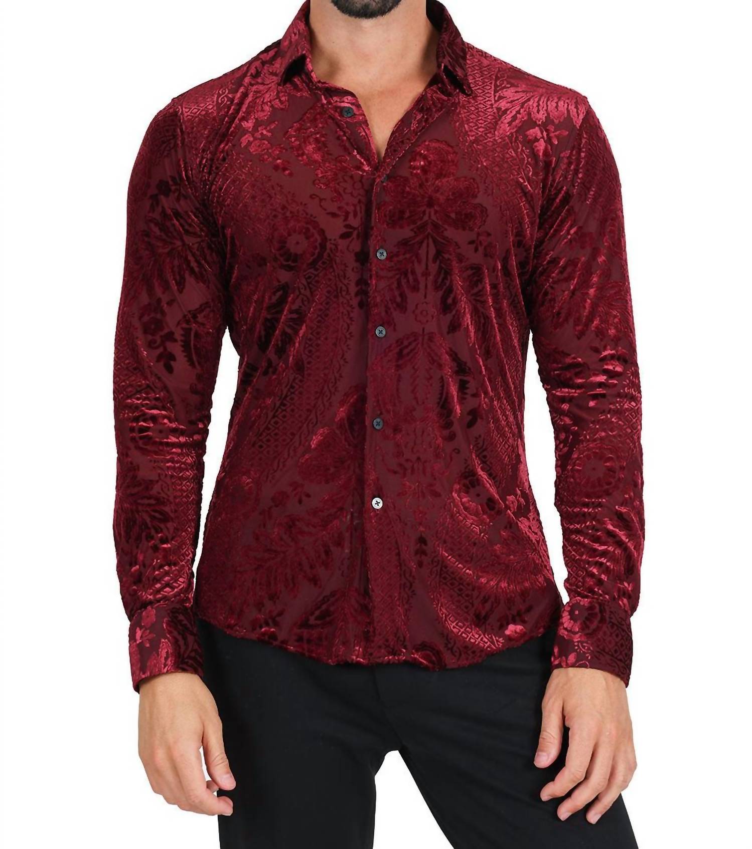 Introducing the Floral Galore Long Sleeve Shirt by BARABAS, a pinnacle of modern luxury in men's casual wear. Crafted from a lightweight blend of 97% cotton and 3% spandex, this shirt features a sophisticated see-through paisley and floral design, perfect for making a statement. With a classic collar and button-up closure, this shirt seamlessly combines elegance with comfort. Imported and designed for easy care, it's recommended to dry clean and avoid bleach for maintaining its rich wine hue. Ideal for holiday parties, embrace the boho chic trend with this stylish piece.