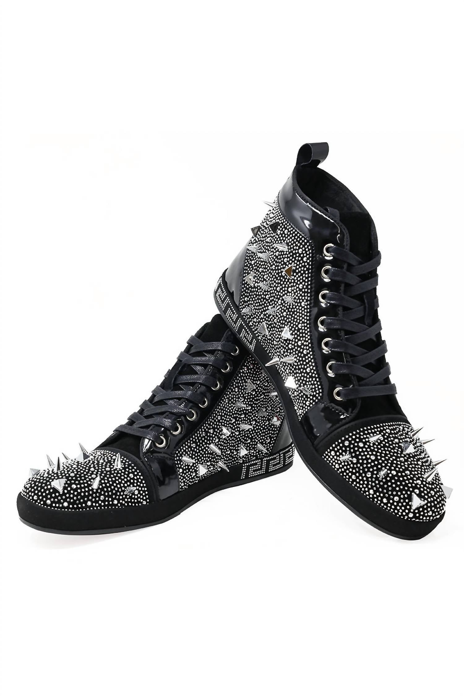 Elevate your footwear game with the Men's Show Stopper Spike High Top Sneakers by BARABAS. These ankle-height sneakers feature a luxurious rhinestone and spike diamond upper, complemented by shiny black leather accents. Crafted with a 100% genuine leather upper and a man-made sole, they offer a mix of opulence and durability. Featuring a convenient lace-up closure and a stylish round toe, these sneakers are ideal for those who wish to shine throughout summer. Care for them easily with spot cleaning.