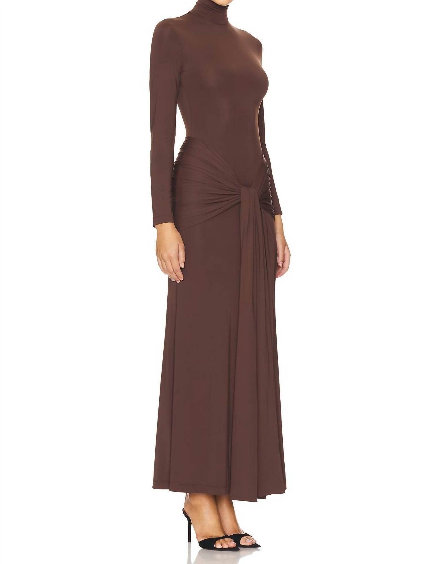 The Alix Maxi Tie Front Long Sleeve Dress by BARDOT is your go-to for dinner party elegance in a rich chocolate brown. This fit-and-flare dress of long sleeves and a high neckline delivers a sleek silhouette with its knit maxi design. Made from polyester, it offers a functional tie front skirt enhanced by a zip closure, measuring 55.5" in length. Perfect for the fall season, the dress demands gentle care with hand wash and line dry instructions. Main base: 95% polyester, 5% elastane. Mesh: 95% polyester, 5% elastane. Tie: 97% polyester, 3% elastane.