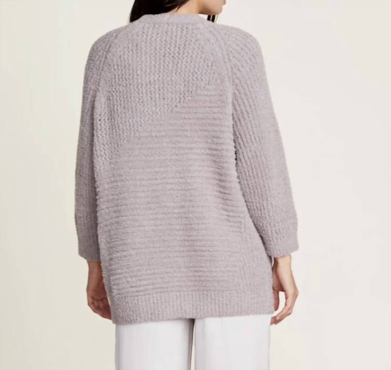 Discover the Cozy Twist Raglan Cardigan by BAREFOOT DREAMS in the serene Beach Rock hue, a perfect addition to any travel wardrobe. Designed with three-quarter raglan sleeves, this cardigan combines 56% polyester and 44% cotton for a light yet soft feel. It features a textured pattern with coconut buttons and front patch pockets, adding a touch of interest. Closure type: Button closure. Care instructions: Machine wash cold on a gentle cycle, lay flat to dry or tumble dry low, and avoid bleach and fabric softeners for long-lasting wear.