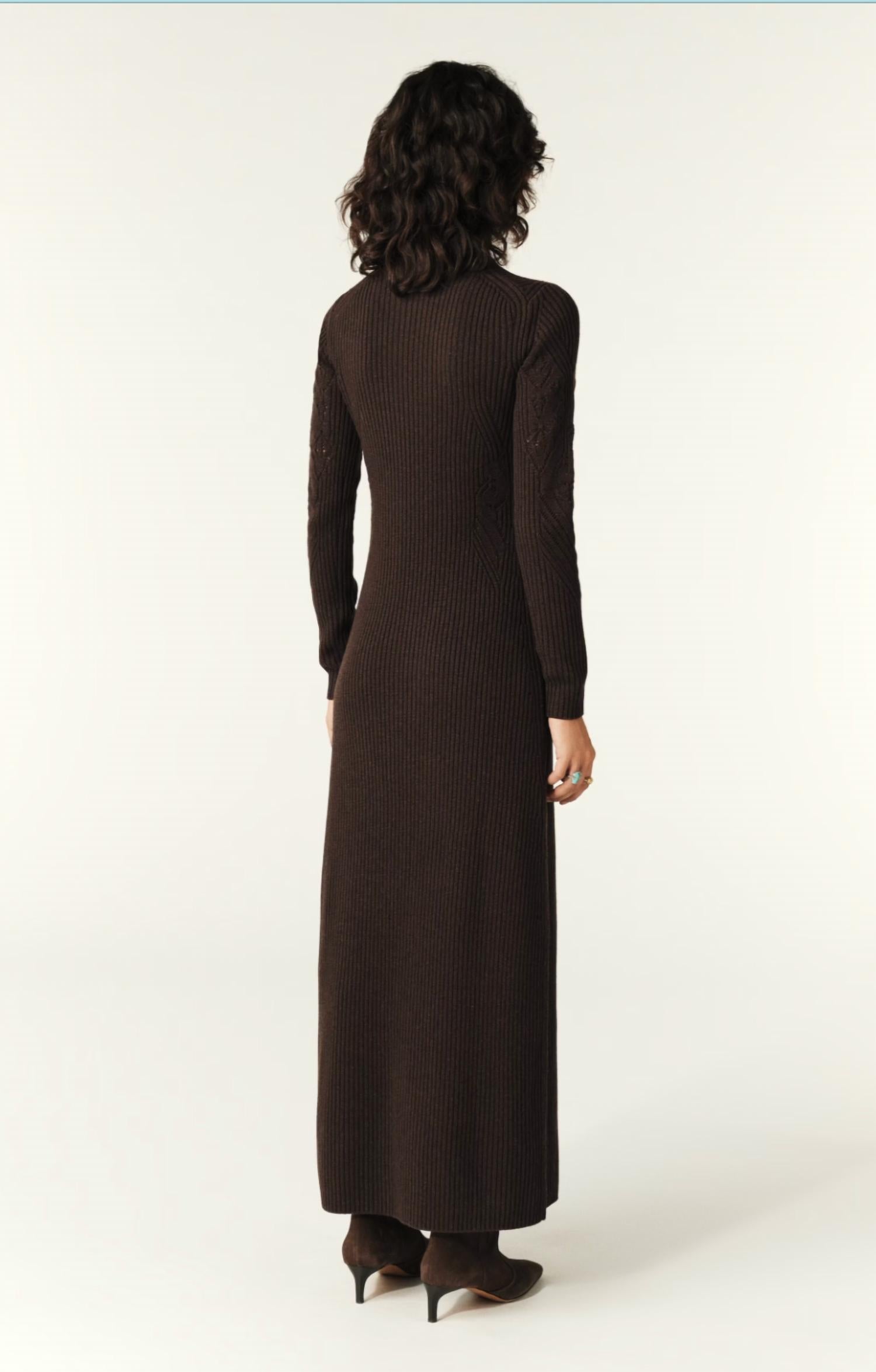 Who doesn't love a good maxi dress? This one you'll be reaching for season after season. Introducing the Bash Armia Sweater Dress, a refined choice for the fall season in an elegant brown hue. This dress features long sleeves and is composed of 50% wool, 30% polyester, and 20% viscose, offering both warmth and style. Crafted in a midi sheath silhouette with a mockneck, it highlights arabesque pointelle knit detailing and a side slit for added flair. This pull-on style piece demands hand washing and line drying to maintain its sophisticated appeal.