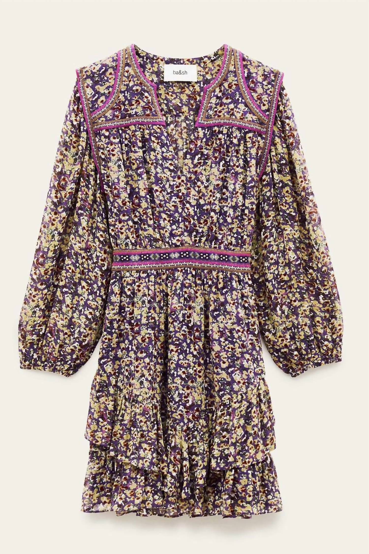 Just add slides or mules and you are good to go. The Bash Loly V-neck Dress is a stunning piece in a vibrant violet multi-color, perfect for a boho chic style. Made from high-quality viscose, it features long sleeves and a trendy A-line silhouette with tiered layers. Closure type is pull on, ensuring a seamless fit. Easy to care for, simply machine wash and line dry for best results.