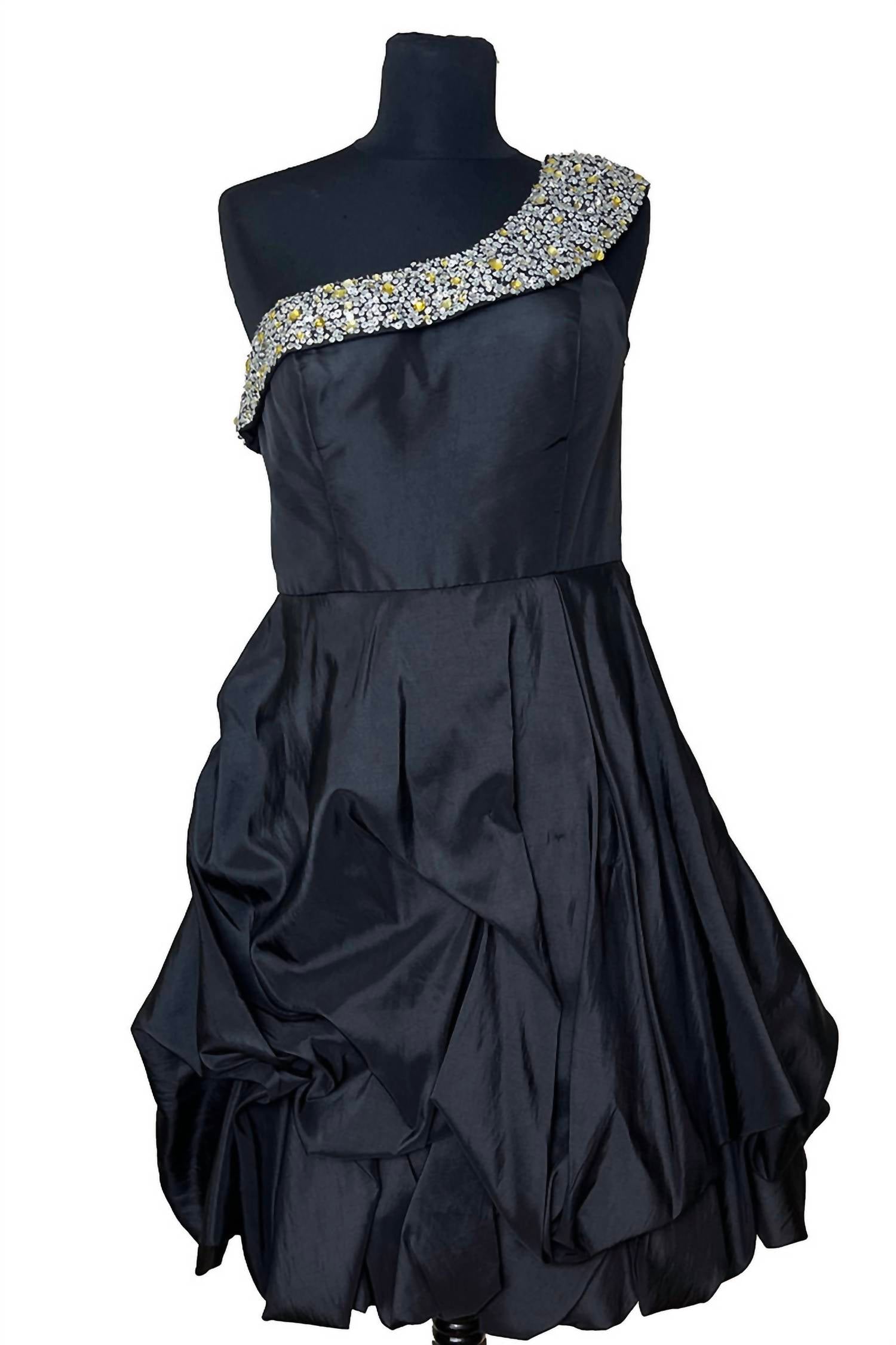 Experience the elegance of the Women's One Shoulder Taffeta Dress by Basic II, a sleek choice for your next evening event. This solid black mini dress boasts a sophisticated off-the-shoulder neckline and an eye-catching A-line silhouette. Made in a sleeveless design, it features a convenient zip closure for easy wear. Perfectly aligned with the Quiet Luxury trend, this dress is your go-to for spring occasions.