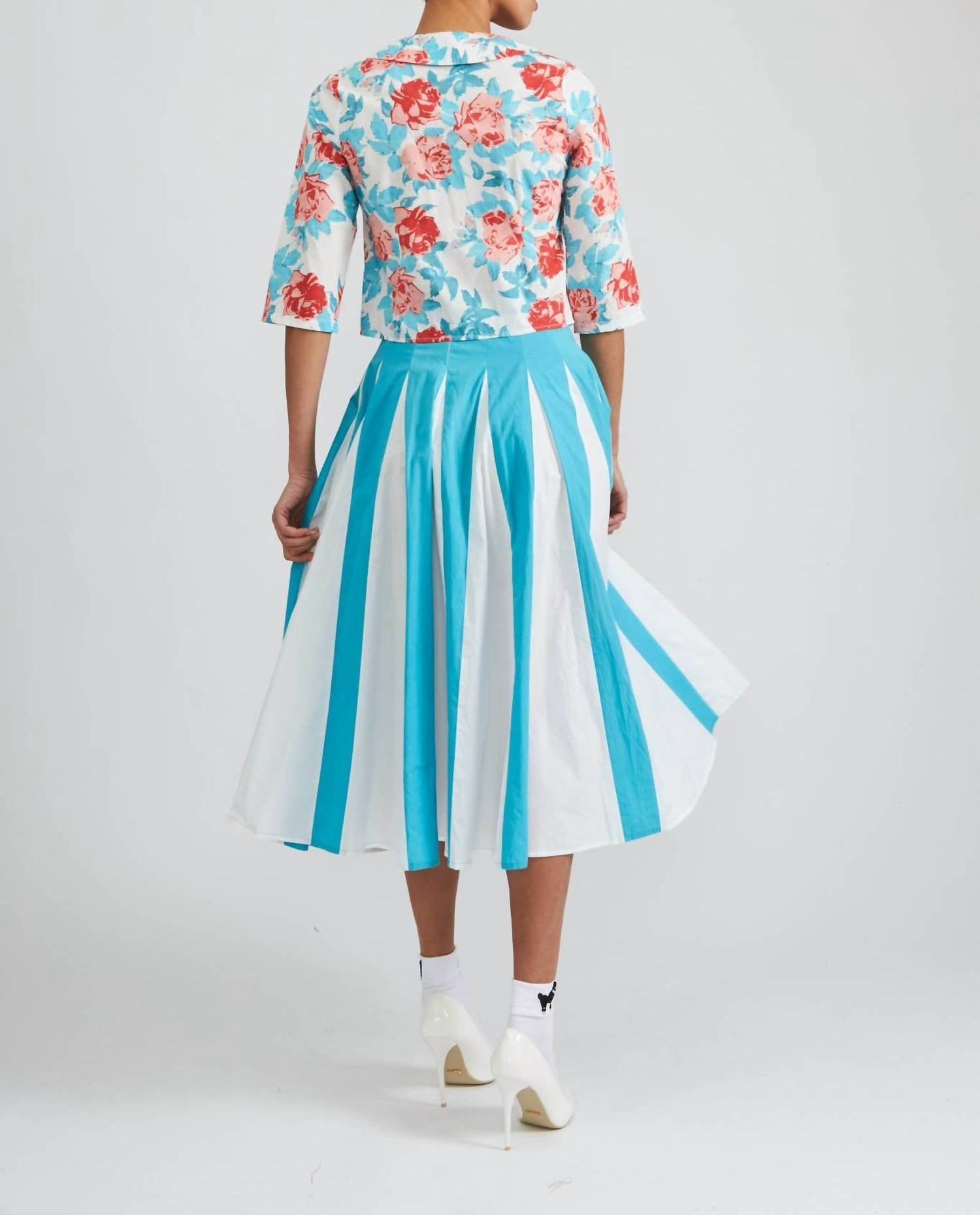 Apresentamos a Saia Freya da Batsheva, uma peça chique no estilo cheerleader em azul-escuro vibrante. Esta saia midi é confeccionada em popeline 100% algodão e é habilmente confeccionada na Índia. Possui um prático fecho de zíper na costura lateral e mede 80 cm de comprimento, proporcionando um caimento perfeito. Fácil de cuidar, basta lavar na máquina com água fria e secar no varal. Perfeita para celebrações sazonais e looks de primavera elegantes.