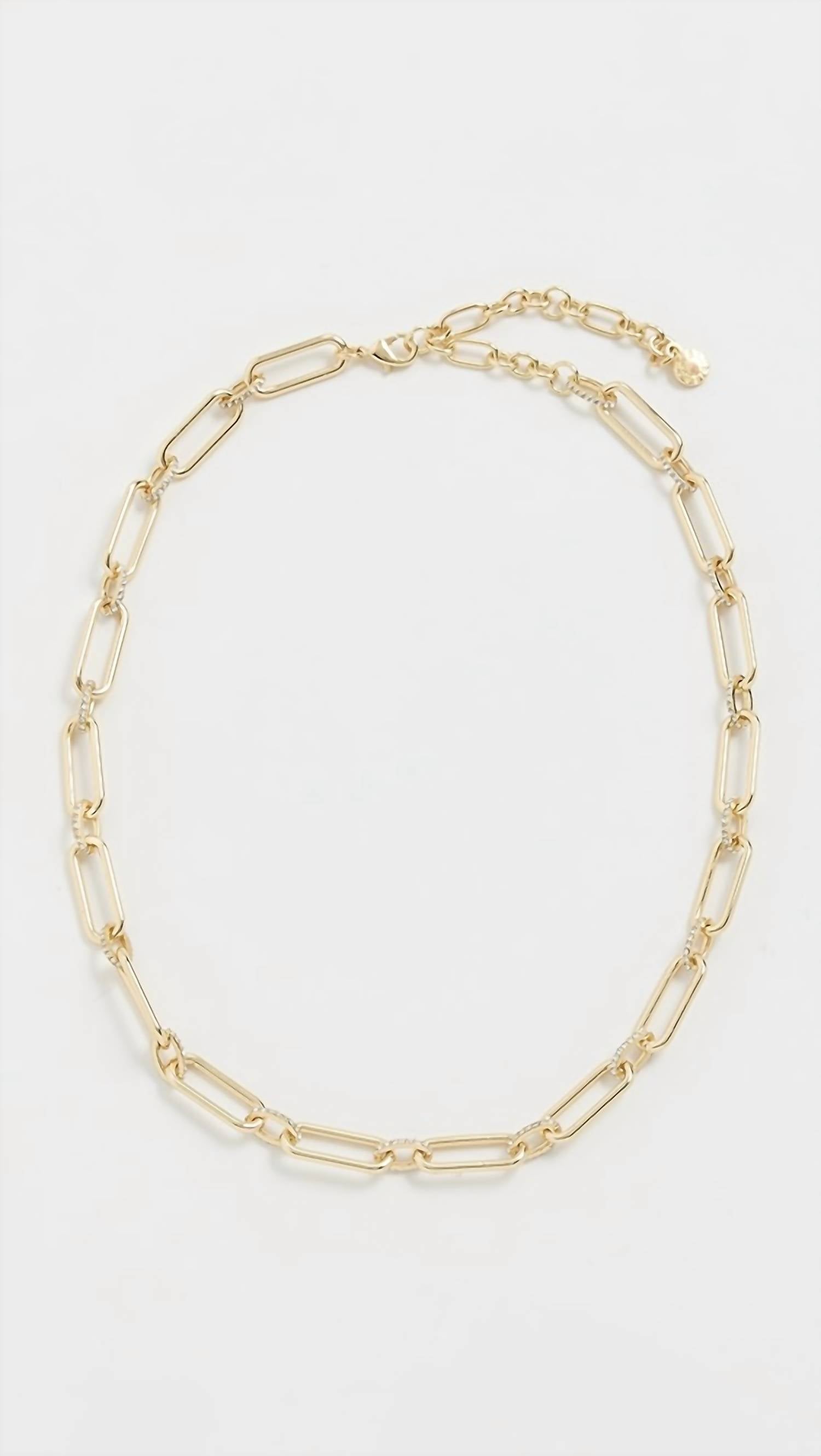 The BaubleBar Delia Chain Necklace in gold is a statement piece crafted from durable brass and enhanced with a luxurious gold plating. Measuring at a length of 16.25 inches, this fashion pendant is designed to add sophistication to any outfit. It features intricately linked chains and secures with a reliable lobster clasp. This elegant necklace embodies exclusivity and class.