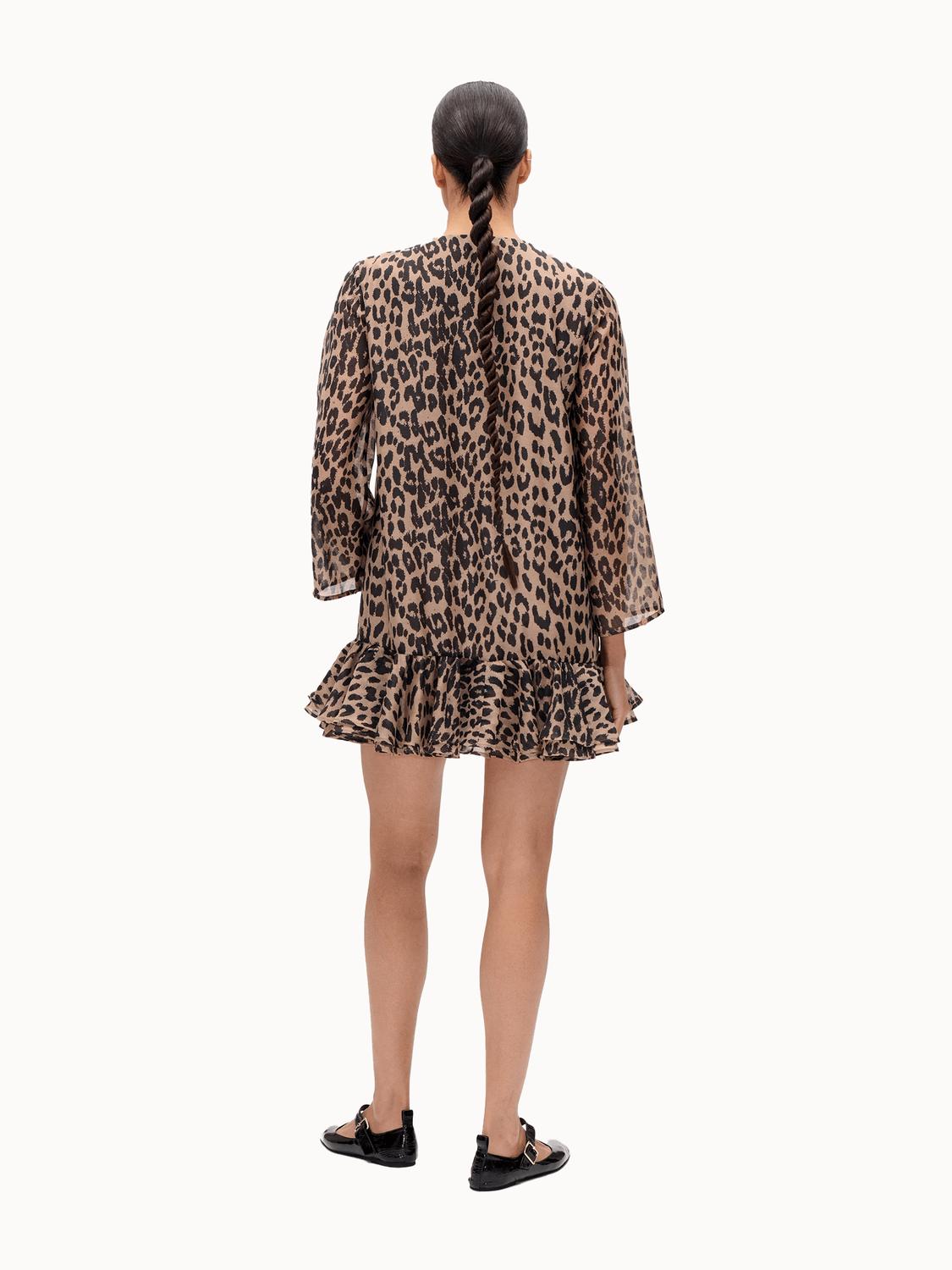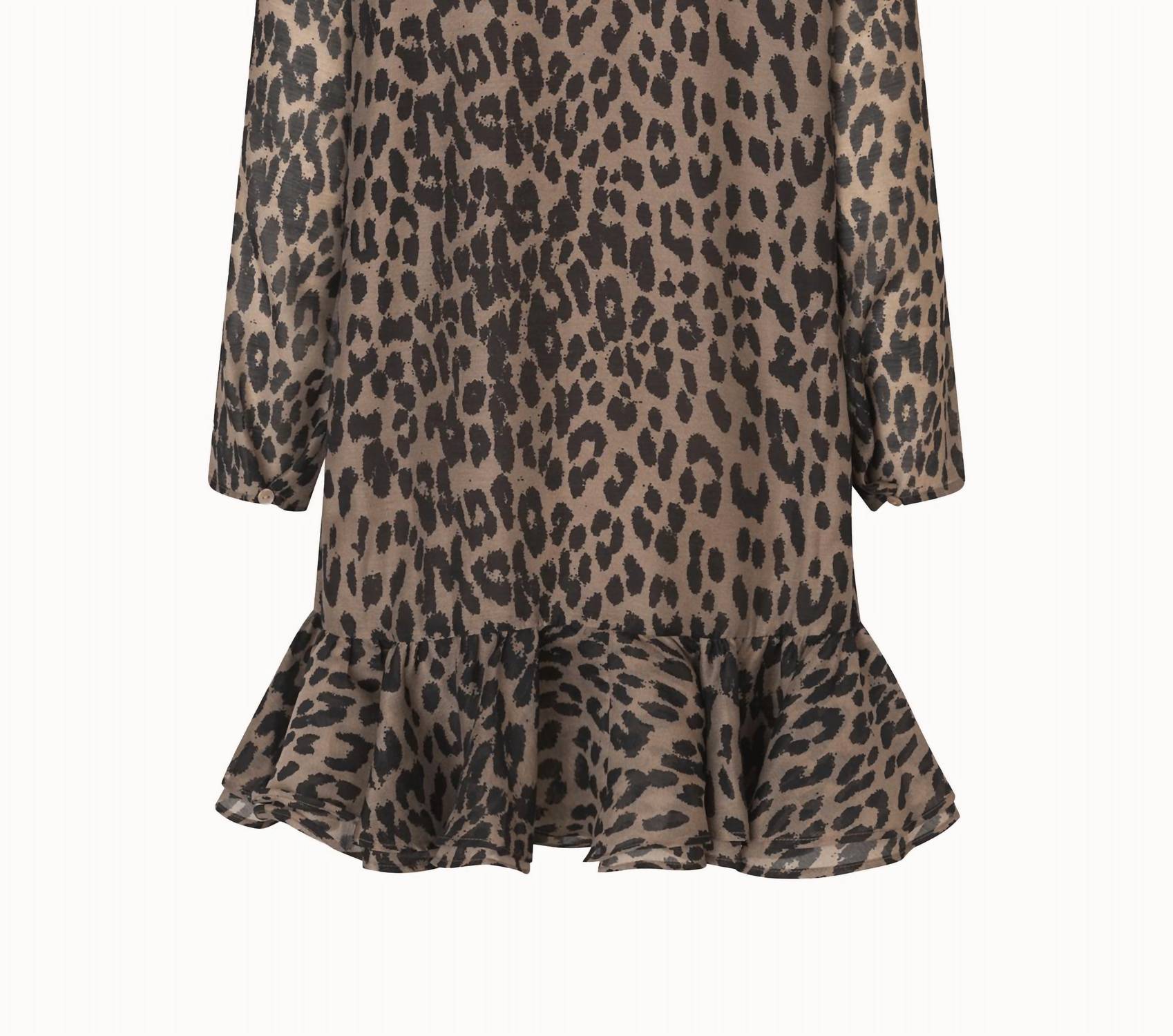 Elevate your cocktail party ensemble with the Agnel Dress by BAUM UND PFERDGARTEN, showcasing a sophisticated Brown Baum Leopard pattern. This women's mini dress features a loose-fit shift silhouette with long sleeves, a v-neckline, and a charming ruffle at the hemline. Crafted from 65% recycled polyester and 35% polyester, it embodies Boho Chic vibes, perfect for Fall or New Year's Eve celebrations. Designed with a pull-on closure for effortless wear, this dress is a nod to sustainable fashion without compromising on style.