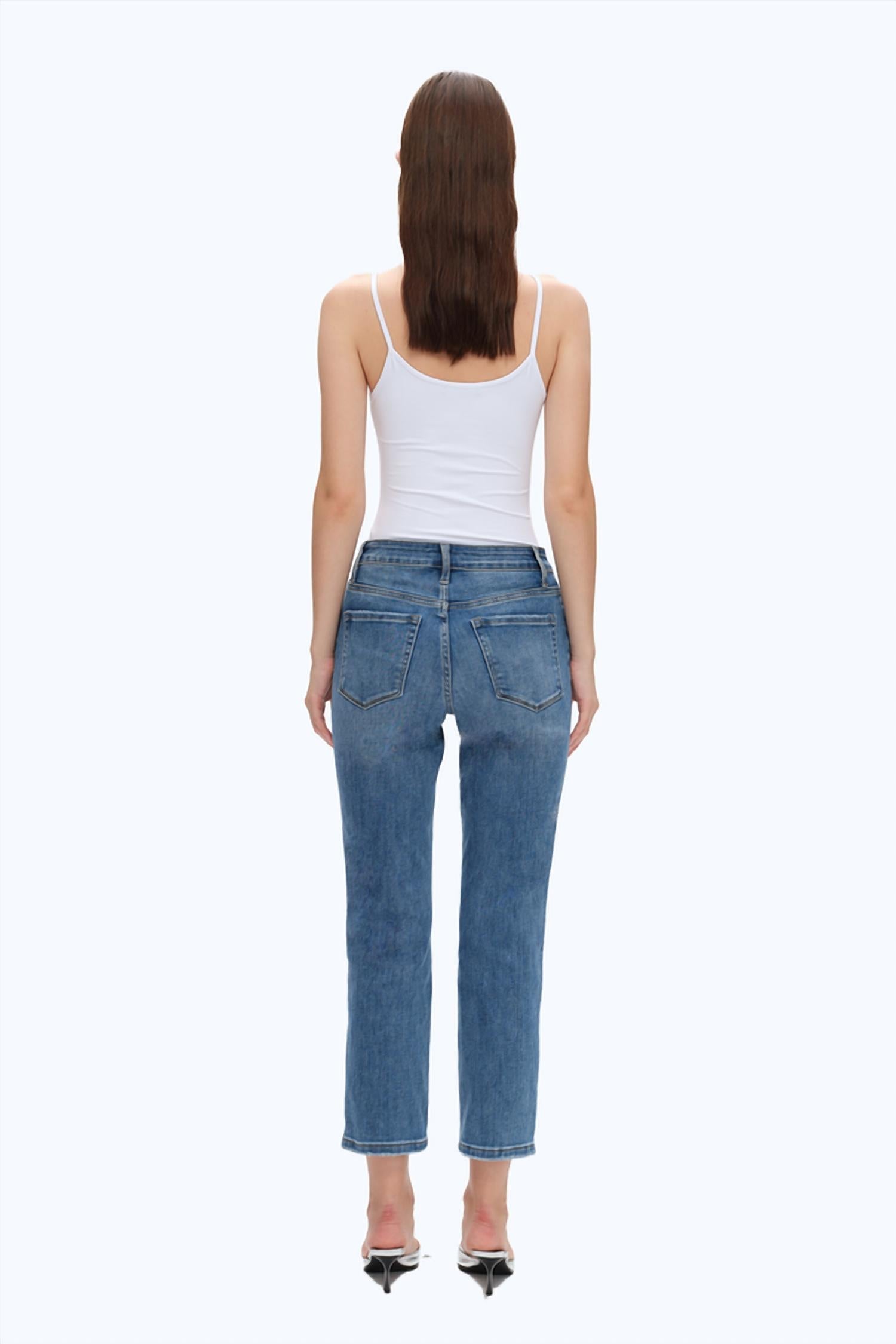 Step up your style with the High Rise Cropped Straight Leg Jeans by Bayeas, offering a perfect blend of comfort and fashion. Crafted from a cotton blend, these medium blue jeans highlight a flattering high-waisted design with a slim fit and straight leg. The versatile crop inseam measures 27 inches, creating an ideal pairing with any shoe, while the knife-cut pocket detailing adds a chic edge. Closure: Button closure. Care: Machine wash and tumble dry. Model is 5'8" wearing size 26 (26 3/4'' waist, 10'' front rise).