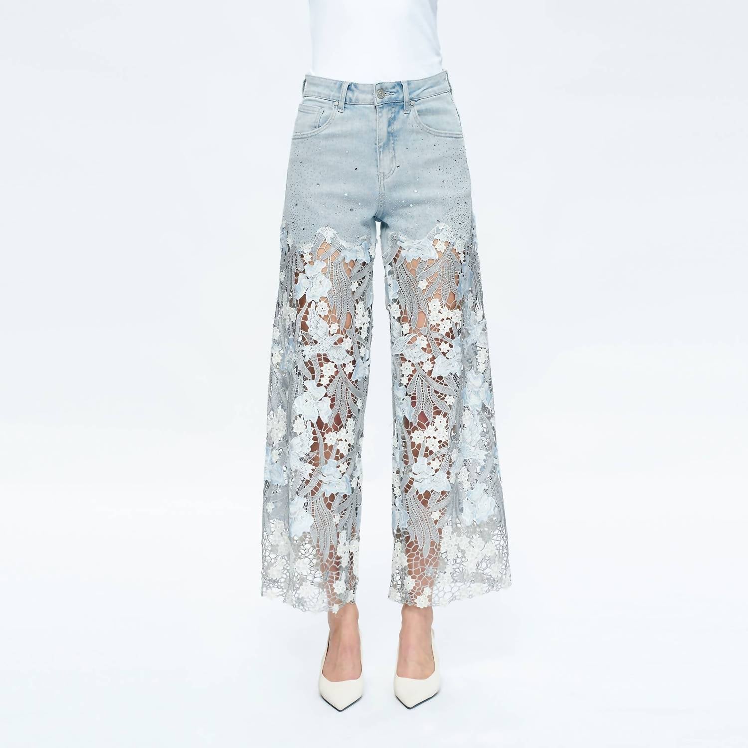 Bayeas - High Rise Wide Leg Jeans With Lace Spliced