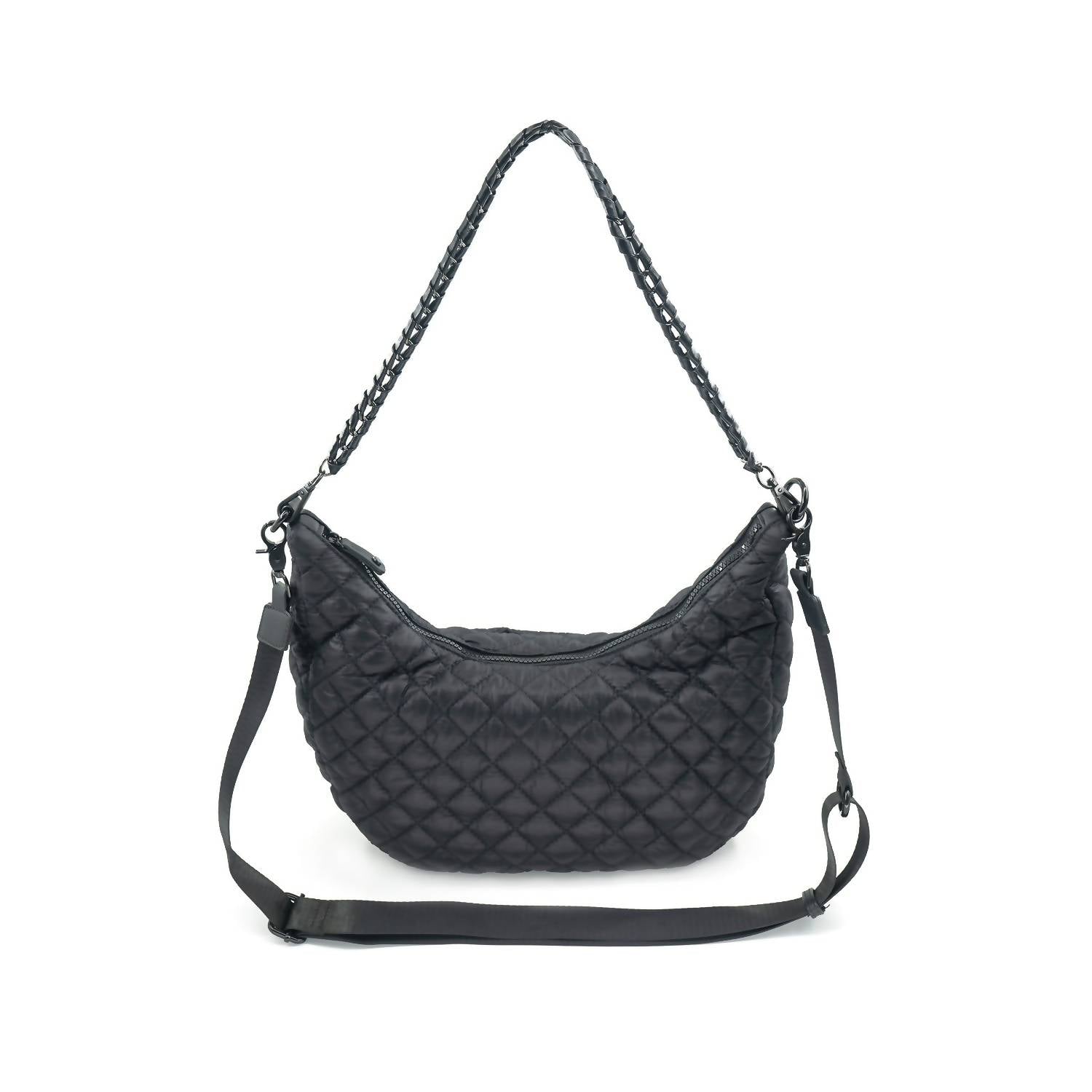 Marly is a Quilted Nylon bag that has a braided chain and webbed crossbody strap.