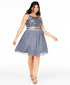 Aproximadamente 96 cm de comprimento, do centro do pescoço até a bainha. O comprimento é baseado no tamanho 48W e varia 1,2 cm entre os tamanhos. | Decote halter; modelagem ajustada e ampla | Fechamento por botão de pressão nas costas; fechamento por zíper nas costas | Renda de lantejoulas no corpete; strass na cintura; saia de chiffon