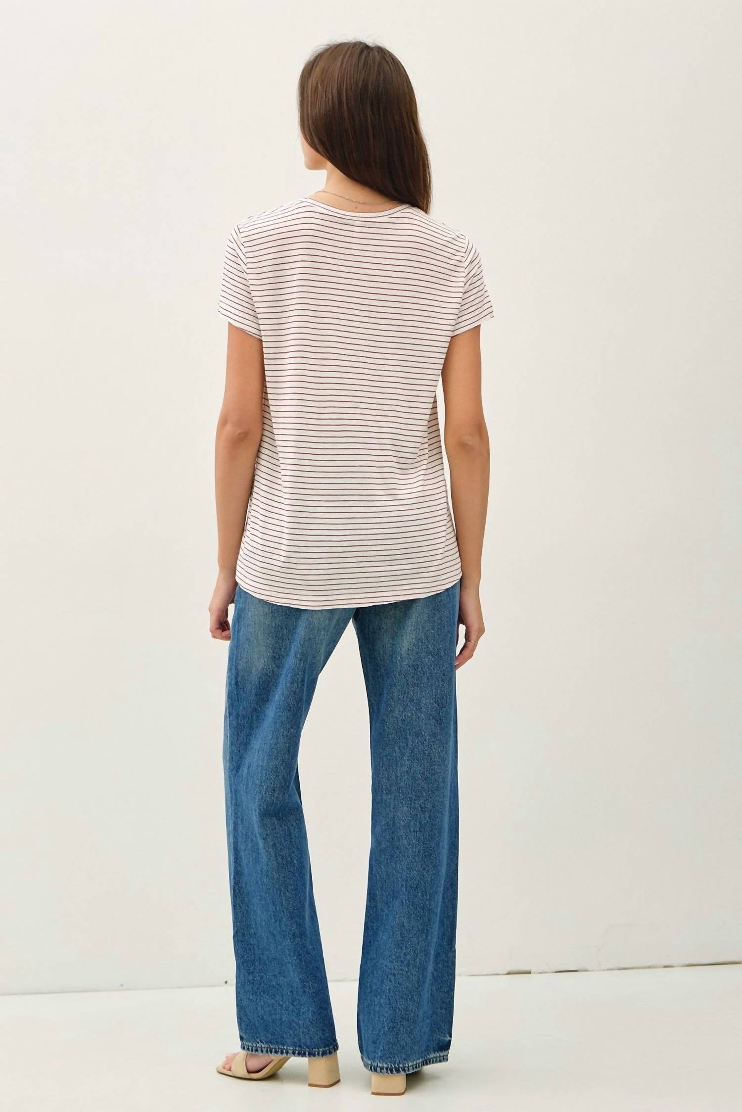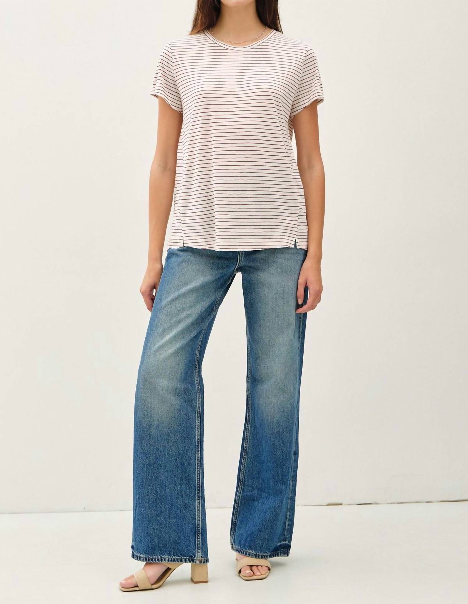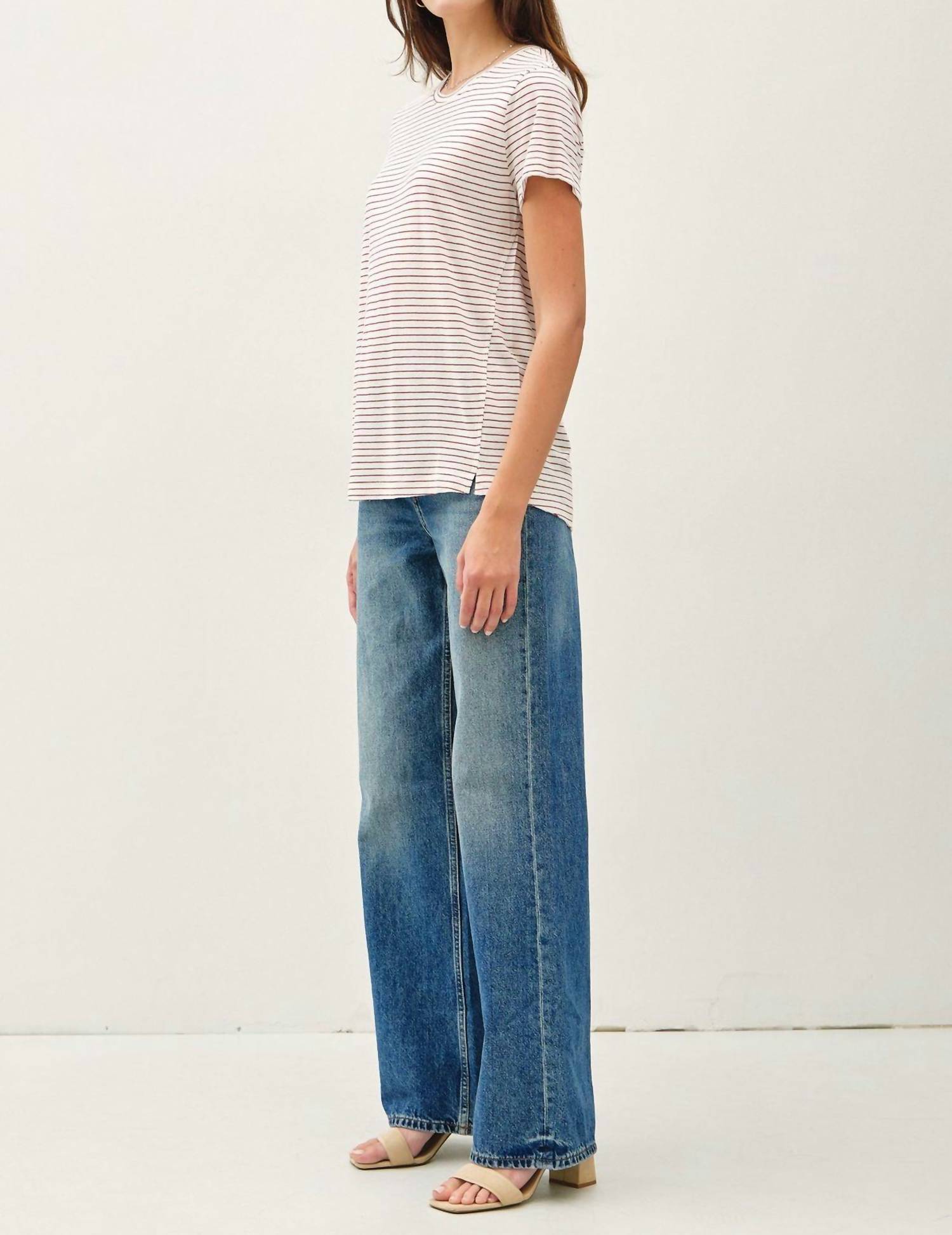 A camiseta de manga curta que você vai querer em todas as cores. Esta é uma camiseta casual com corte relaxado e pequenas fendas laterais, feita de um tecido leve. Contém 58% algodão, 28% linho e 17% rayon.