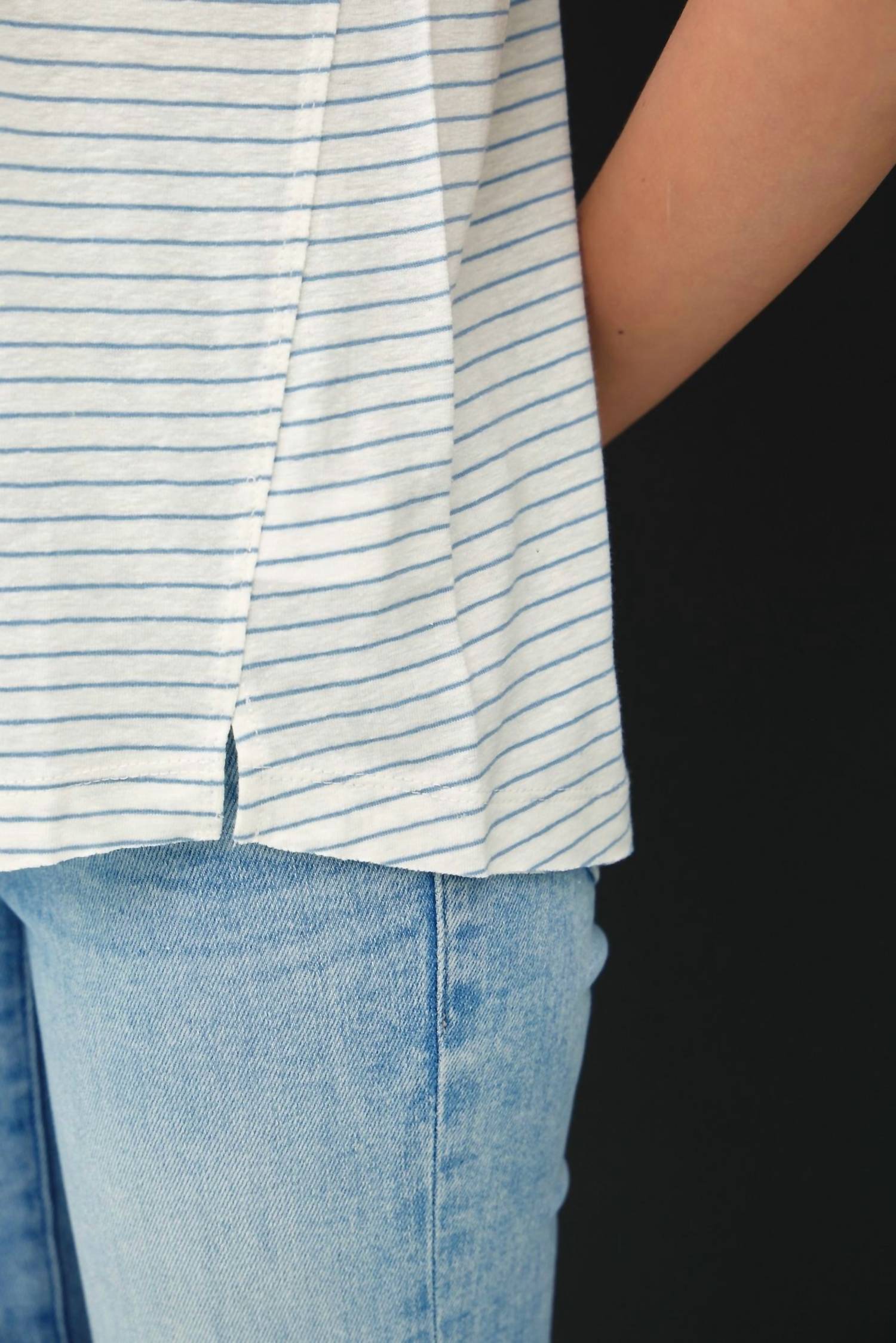 Esta é uma camiseta casual com corte relaxado e pequenas fendas laterais, feita de um tecido leve. Contém 58% algodão, 28% linho e 17% rayon.
