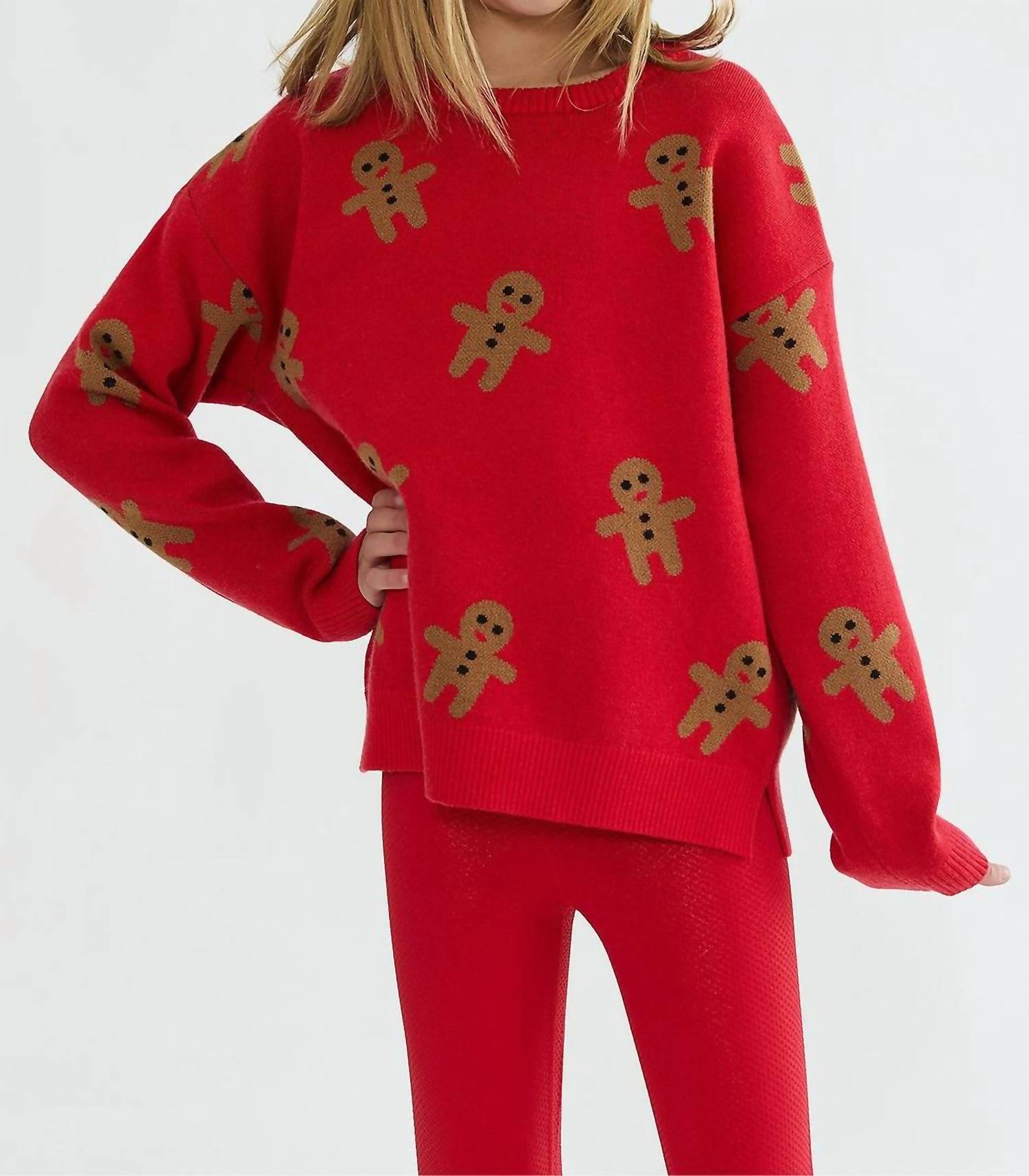 Introducing the Little Callie Sweater by Beach Riot, a delightful piece for your little one's holiday wardrobe. This gingerbread-patterned sweater features cozy long sleeves and is crafted from a soft knit blend of 50% Rayon, 28% Polyester, and 22% Nylon. Ideal for Christmas gatherings and seasonal layering, it offers a relaxed fit with a crew neckline detailed with ribbed trim. Care instructions recommend hand washing cold and laying flat to dry for lasting comfort and style.