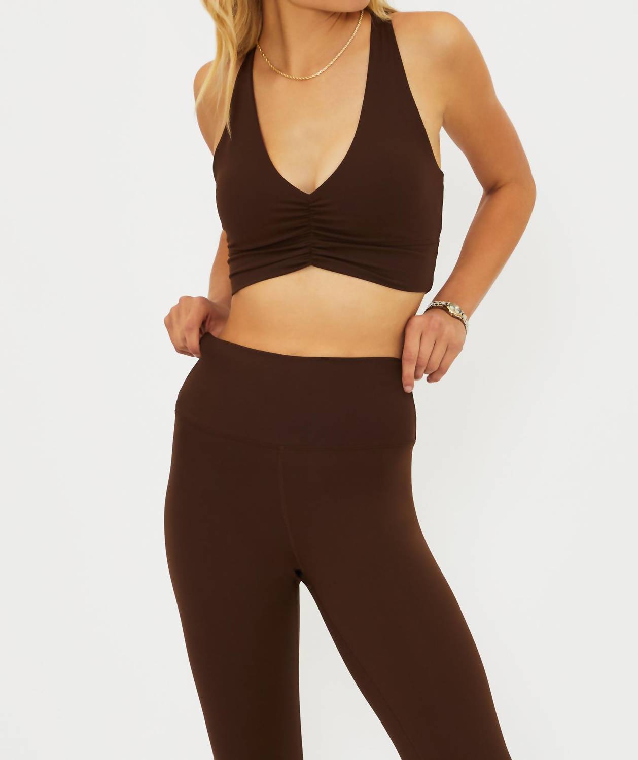The perfect crop top for those warmer weather days. Introducing the Mindy Sleeveless Top by Beach Riot, a must-have in a sultry chestnut shade for your activewear collection. This women's swim top features a V-neck and classic triangle bikini style, offering a flattering fit with its solid pattern. Designed for athleisure and fitness, it provides classic coverage and comfort during workouts or casual outings. Crafted for easy wear, this top features a pull-on closure and can be machine washed and line dried.