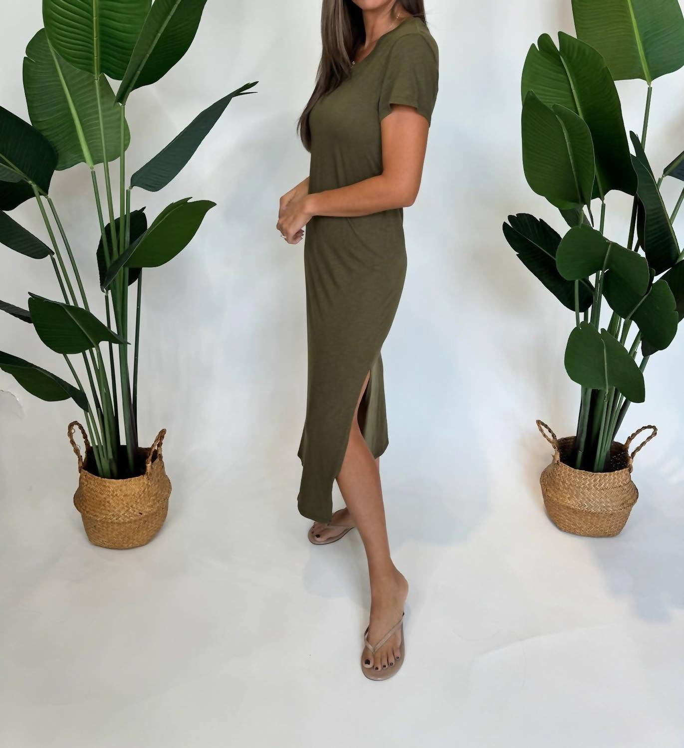 Style this maxi with your favorite statement necklace and sandals for the perfect look. Introducing the Bella Dahl Knitted V-neck Maxi Dress, a minimalist masterpiece perfect for any vacation getaway. The dress features short sleeves and a comfortable pull-on closure, crafted from a premium blend of 60% cotton and 40% modal. This A-line silhouette maxi dress includes a bottom slit on both sides and exudes effortless elegance in its solid olive color. Care is simple with machine wash cold and tumble dry low instructions, making it an ideal choice for summer styling.