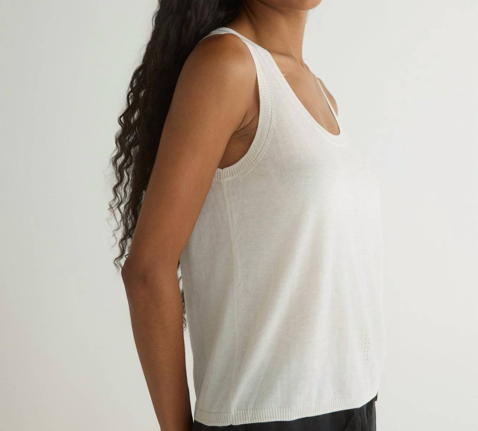 The Bella Dahl Sleeveless Scoop Neck Knit Tank is your go-to minimalist piece for summer. Crafted from a luxurious blend of 85% Tencel 15% Cashmere, this tank features a flattering scoop neckline with eye-catching stitch detail. It's available in chic solid colors like black and off-white and offers the convenience of a pull-on style. For care, hand wash cold with like colors, avoid bleaching or tumble drying, lay flat to dry, and iron at low heat. Model Alexia is 5'10" and wears a size small.