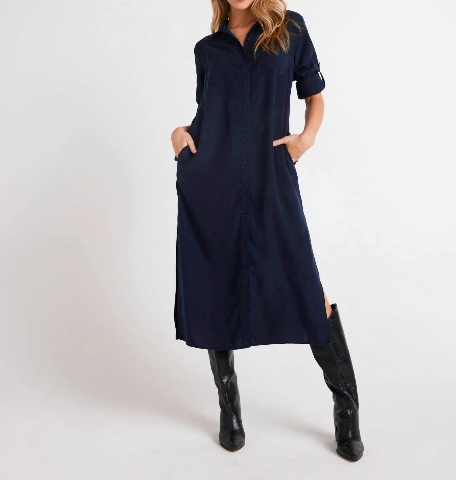 Just add slides or mules and you are good to go. Introducing the Bella Dahl Western Yoke Duster Midi Dress in Vintage Black, a chic addition to your wardrobe with a modern twist on a classic silhouette. Crafted from 100% Lyocell, this solid-shift dress features long sleeves that can be rolled up for added versatility, making it suitable for various occasions. The dress is designed with a stylish collar, side slits, and practical pockets, complemented by a button closure for easy wear. Perfect for the minimalist trend, this dress knows no boundaries, from holiday parties to casual gatherings.