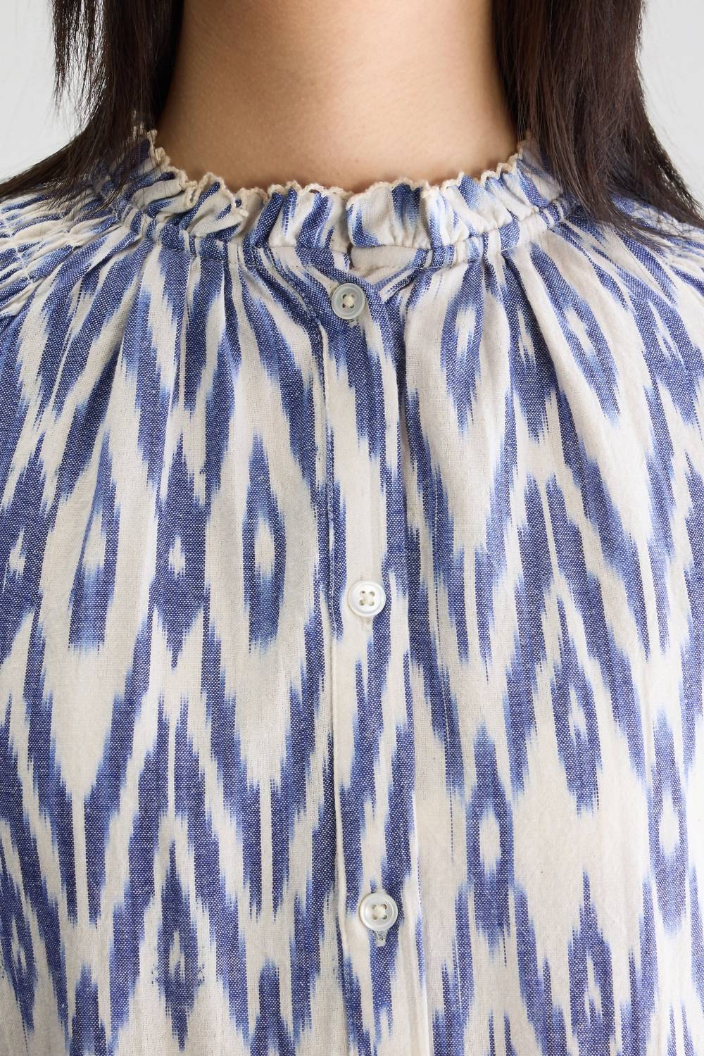 Elevate your wardrobe with the Cassis Button Down Top by Bellerose, a bold choice for those seeking a maximalist style. Featuring long raglan sleeves with smocked cuffs and a distinctive raised frilled collar, this top brings a unique touch to your vacation attire. Made from ikat cotton, it boasts smocked details on the shoulders and a high-low curved hem. Closure: Button closure. Care: Hand wash and line dry.
