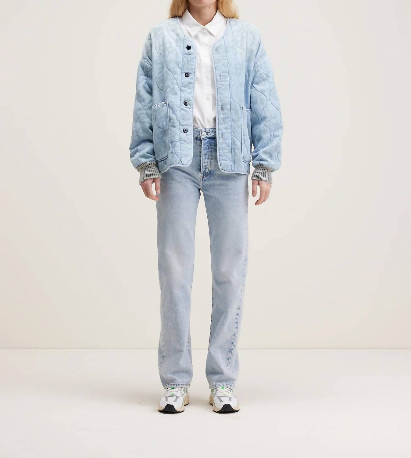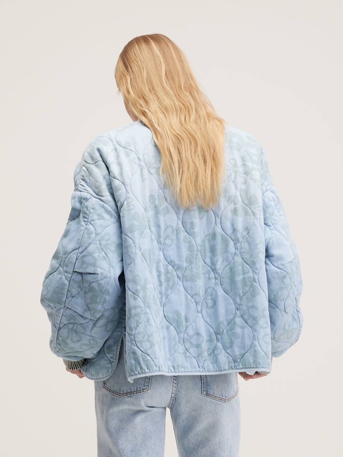 Introducing the Koala Oversized Jacket by Bellerose, a stylish choice for your fall travel wardrobe. This women’s bomber jacket features long sleeves and a V-neck, crafted from 100% cotton denim adorned with naive tone-on-tone floral prints. Made in Tunisia, the jacket is padded and quilted, boasting an oversized fit with dropped shoulders, ribbed cuffs, and a convenient button closure. Care: Machine wash at 30°C, do not bleach or tumble dry, iron at low temperature.