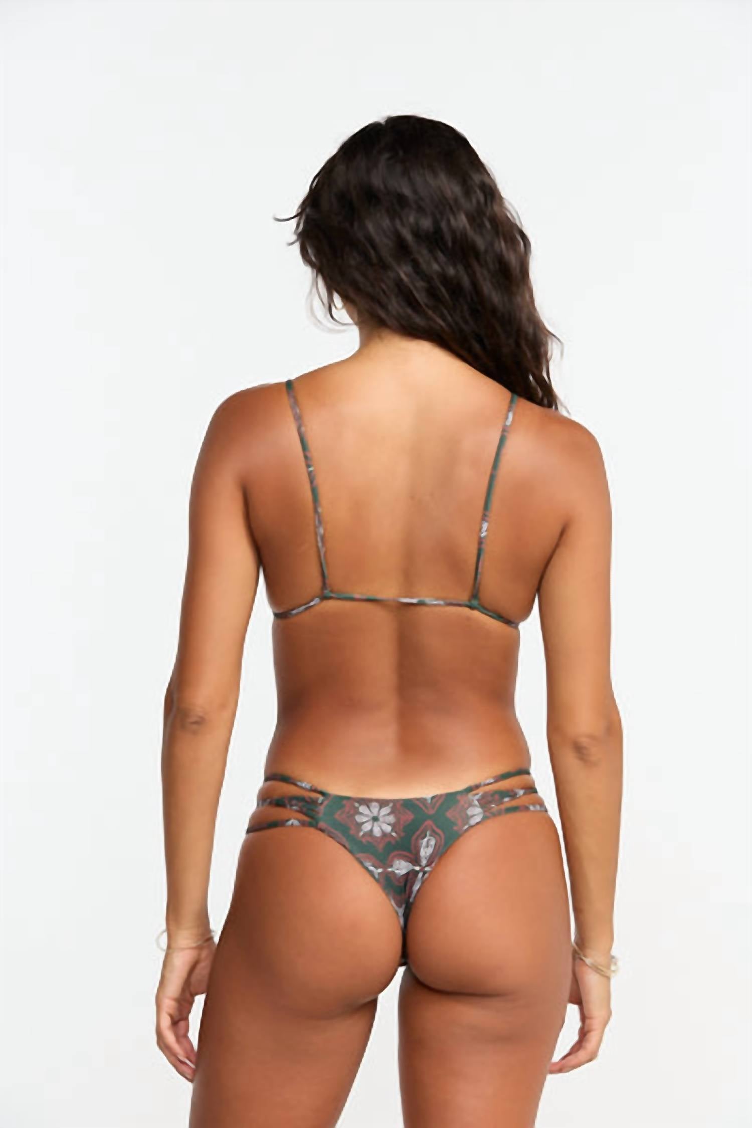 Introducing the Luna Bikini Top by Benoa, a boho chic piece designed for effortless beach style. This patterned triangle top offers skimpy coverage and features a strappy, woven, cut-out detail. Made from 80% recycled nylon and 20% elastane, it is thoughtfully designed in Hawaii and crafted in Indonesia. Care instructions recommend hand washing cold and drying in the shade. Model is wearing a size small.