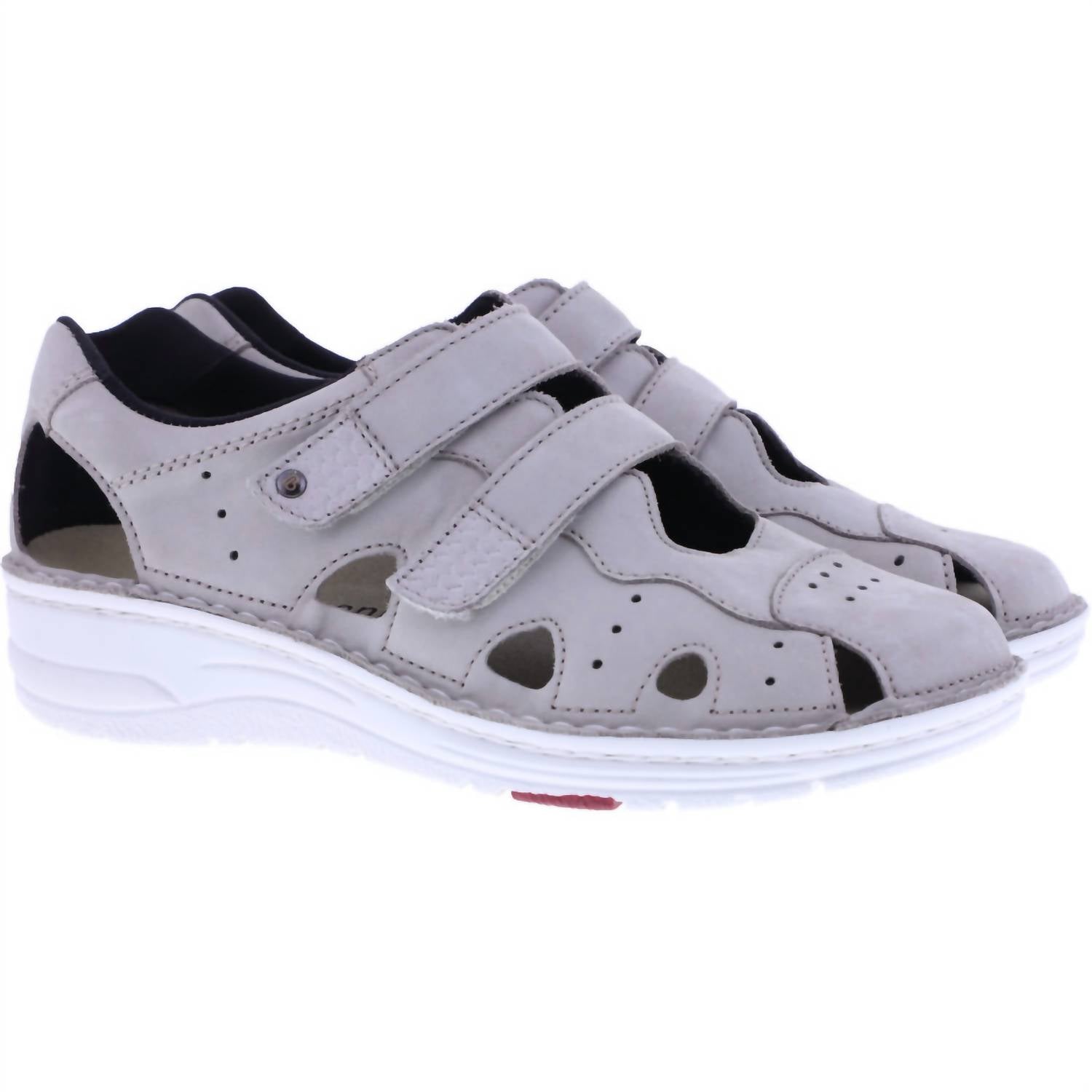 Vestidos esvoaçantes, calças curtas e até macacões... esta sandália combina com todos eles! Estas sandálias são feitas de couro nobuck e apresentam uma palmilha removível, juntamente com duas tiras de velcro para conforto e ajuste ajustáveis.