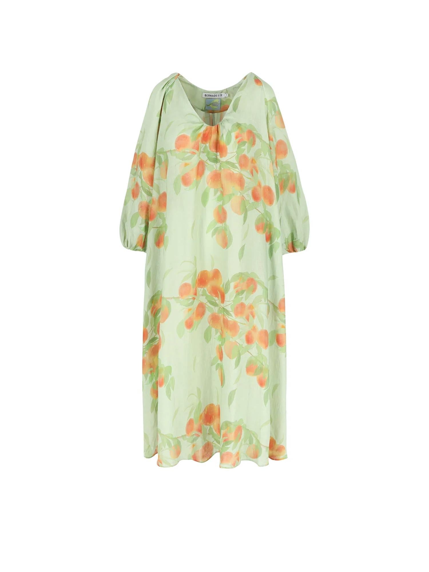 Discover the Georgette Maxi Dress by Bernadette, a must-have for the spring holiday party season with its elegant three-quarter sleeves and V-neck design. This ankle-length dress is crafted from breathable linen and features a unique peachtree pattern on a sage green backdrop, embodying chic maximalism. With convenient pockets and a pull-on closure, it combines style and functionality effortlessly. Care instructions: Dry clean only, ensuring longevity and maintaining the dress's vibrant print.