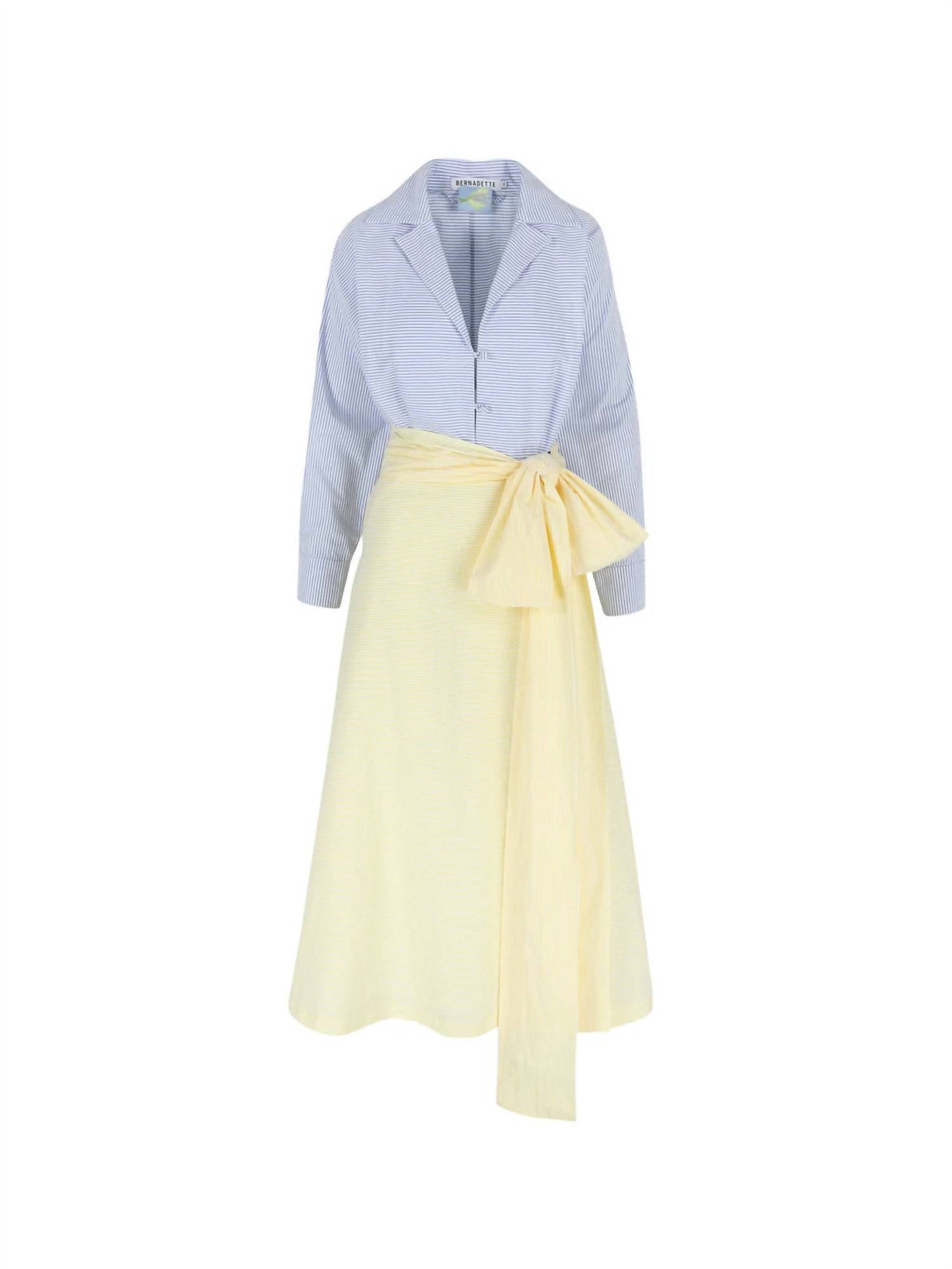 Introducing the Striped Seersucker Maxi Dress by Bernadette, perfect for a holiday party with its maximalist charm. Crafted from cotton, this elegant piece features long sleeves and a collar neckline for a timeless silhouette. The dress boasts a striking blend of blue and ivory seersucker with an ivory/yellow striped mid-length A-line skirt, complete with a tie closure and a removable iconic BERNADETTE bow. Made with convenience in mind, it includes pockets and should be dry cleaned to maintain its pristine condition.