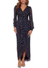 Estampa metálica; plissado na cintura; fenda lateral frontal | Decote sobrepeliz | Fecho de zíper nas costas | Fabricado nos EUA | Mangas compridas | Vestido longo; Vestido formal longo | Fale com um estilista e receba aconselhamento especializado gratuito online ou em lojas para o seu guarda-roupa