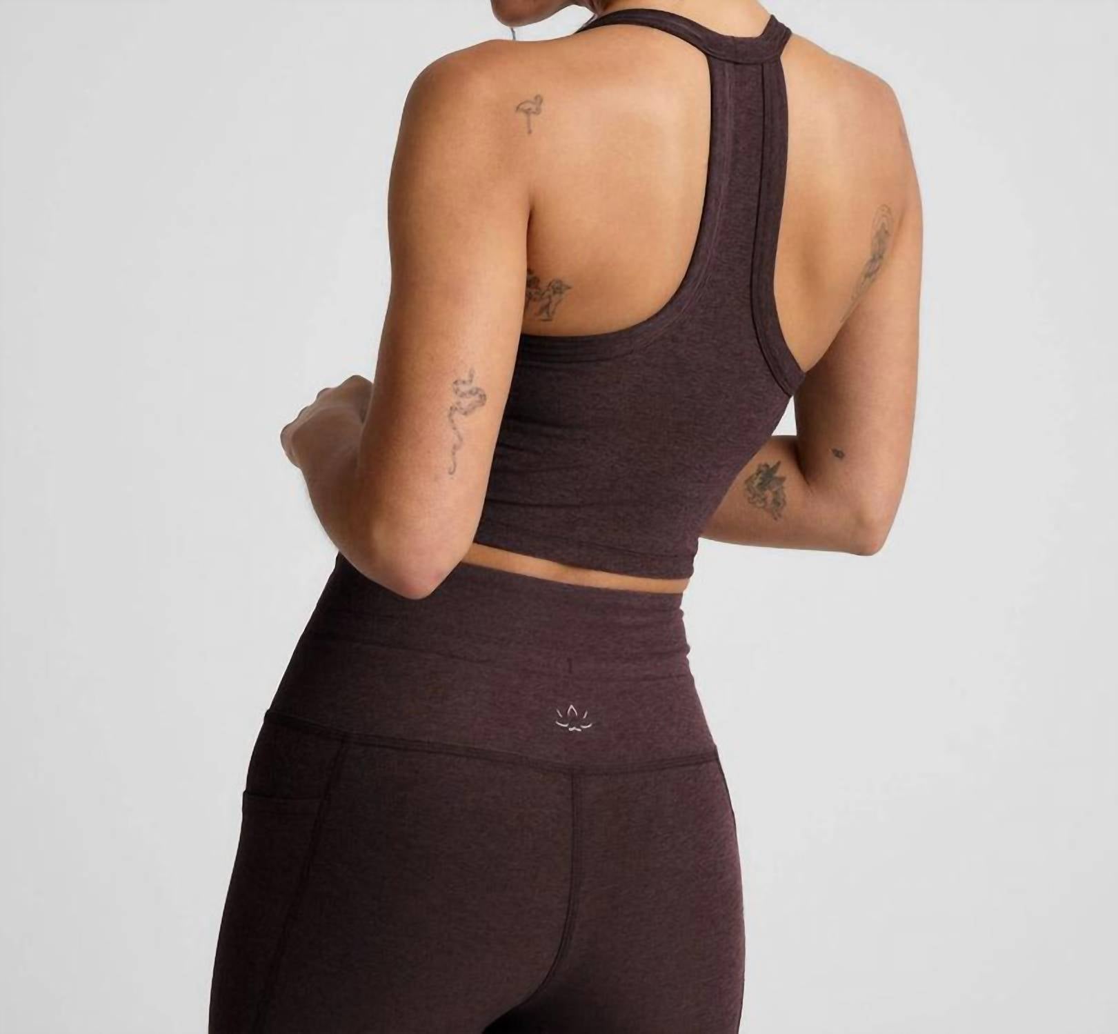 Explore the On The Up Crop Tank by BEYOND YOGA, a seamless blend of style and comfort in rich Dark Chocolate. This sleeveless, cropped tank boasts a self shelf bra and a wide racerback design, all crafted from buttery soft Spacedye fabric, featuring a composition of Polyester. The pull-on style makes it easy to wear, combined with a flattering fit that complements every shape. Care for this activewear piece with hand washing and line drying, ensuring it remains a staple for fitness and minimalist wardrobes.