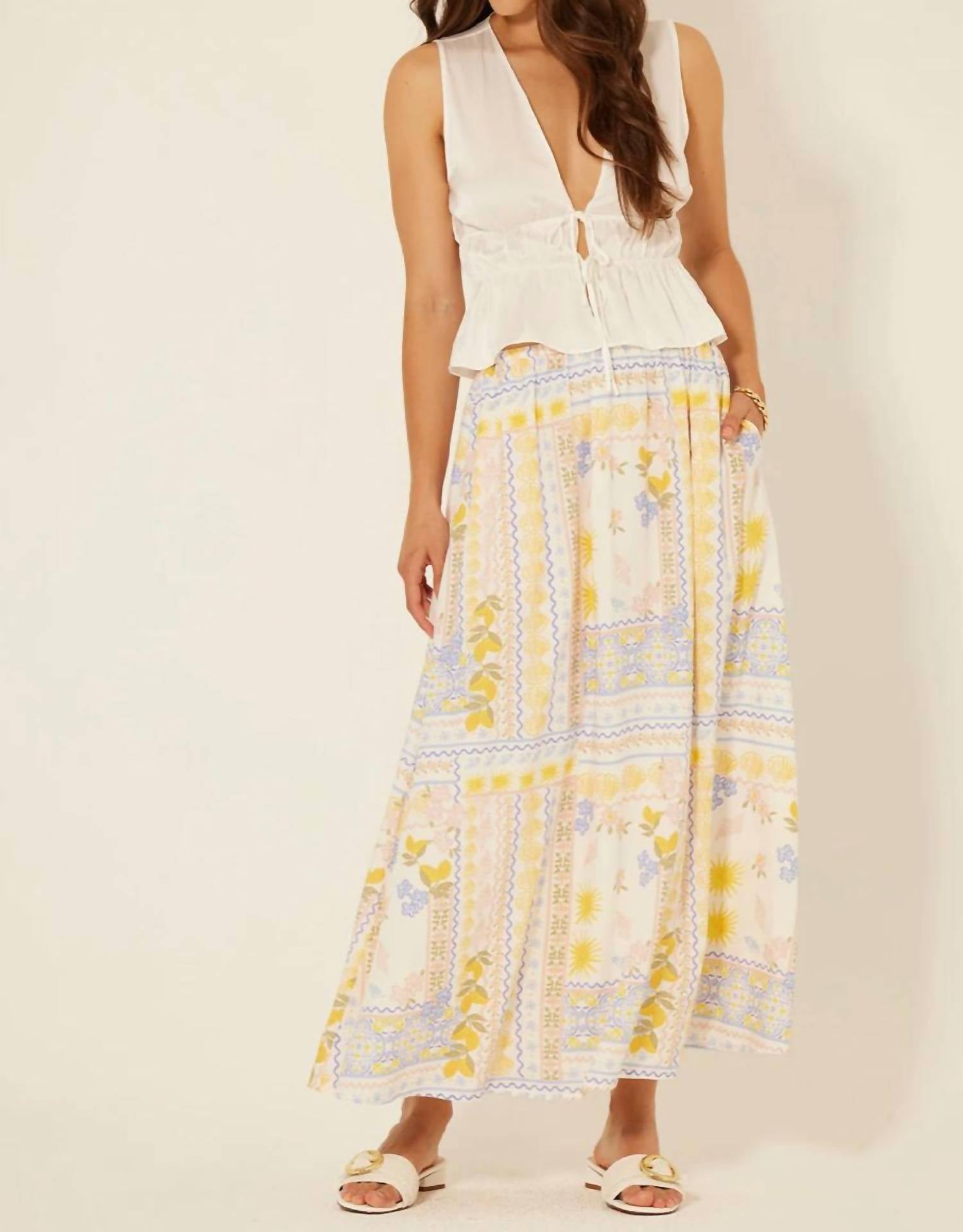 Fluida, confortável e estilosa, esta saia longa é uma das queridinhas dos fãs. Dê um toque boêmio ao seu guarda-roupa com a Saia Longa Landa da BILA77, perfeita para viagens e passeios sazonais de verão. Esta saia estampada multicolorida é confeccionada inteiramente em 100% Liva Eco Modal, garantindo estilo e conforto. Seu fecho pull-on com cós elástico oferece um ajuste impecável, complementado pela praticidade dos bolsos laterais. Cuide desta peça essencial com uma simples lavagem à máquina.