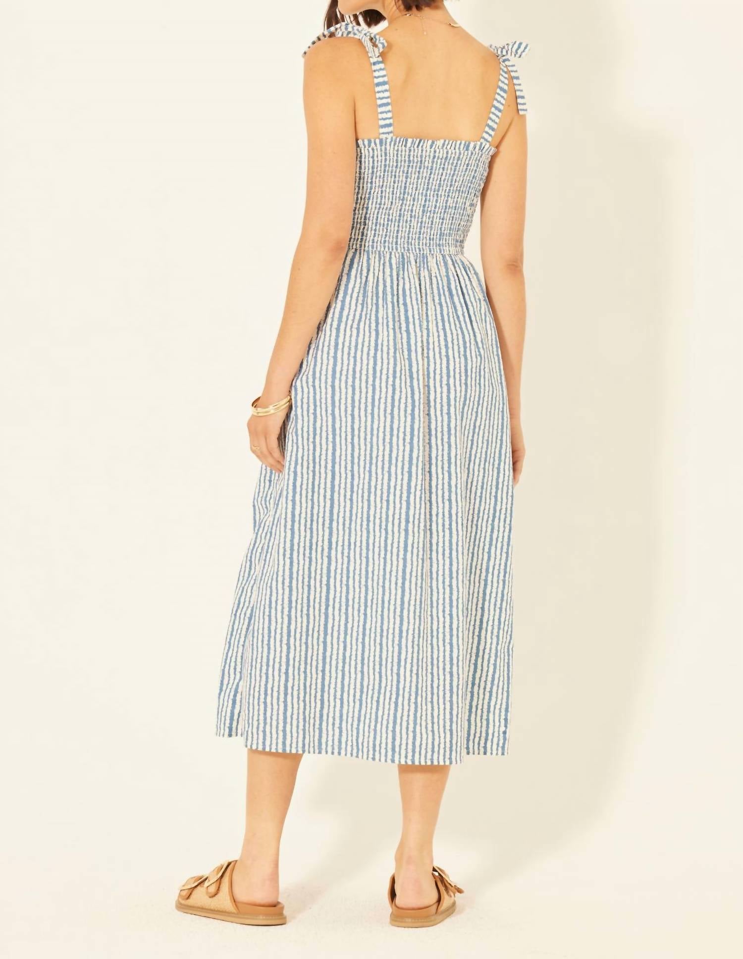 Conheça o Vestido Lindsay da BILA77, um vestido sem mangas, listrado, com corte em A, em um charmoso tom Blue Jasper, perfeito para passeios na primavera. Confeccionado em 100% algodão BCI para maior conforto, possui gola quadrada e alças finas para um look preppy despojado. Este vestido midi é importado e possui um prático fecho de amarrar. As instruções de cuidado incluem lavagem à mão para manter seu estilo vibrante.