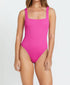Dive into your next poolside adventure with the Summer High Square Neck One Piece by Billabong, a chic choice for minimalist style in Fiesta Pink. This sleeveless swimsuit features a square neckline and a high leg cut for a flattering fit. It's crafted from 69% recycled polyester, 23% polyester, and 8% elastane, boasting a textured pattern for a stylish edge. Closure: Pull on. Complete with medium bum coverage, it's finished with a logo metal plate at the center back.