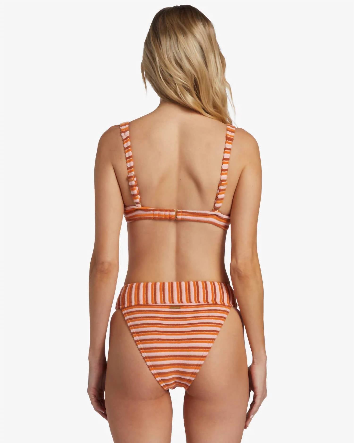 Introducing the Tides Terry Aruba Bikini Bottom by Billabong, a stylish addition to any summer wardrobe in vibrant orange. These cheeky high-waisted bikini bottoms feature a striped polyester fabric inspired by the 1970s with a flattering wide waistband and high-rise leg design. Ideal for beach days, this minimalist swim bottom promises both comfort and standout style. Note: Care instructions are not specified.