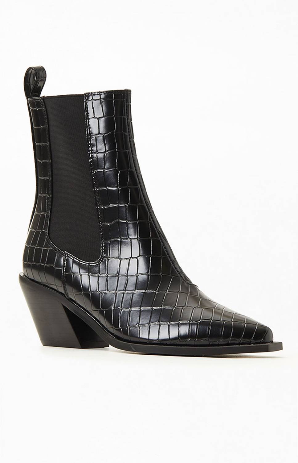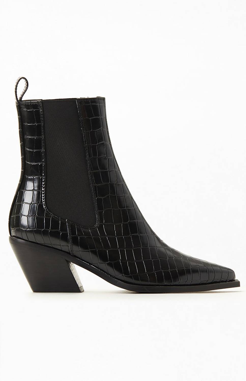 Aprimore seus calçados com estas botas clássicas de salto, projetadas para unir sofisticação e estilo. Confortáveis ​​o suficiente para dias longos ou uma saída à noite. Saia com estilo com as Botas Femininas Ukaya da BiLLiNi, confeccionadas em um impressionante design de crocodilo preto. Estas botas Chelsea de bico fino apresentam cabedal sintético com estampa de crocodilo e elásticos duplos, além de um sofisticado salto bloco de 7,5 cm. Feita para mulheres, esta bota de salto médio combina moda e conforto sem esforço. Aproveite o forro e o solado sintéticos para durabilidade duradoura e um visual elegante.