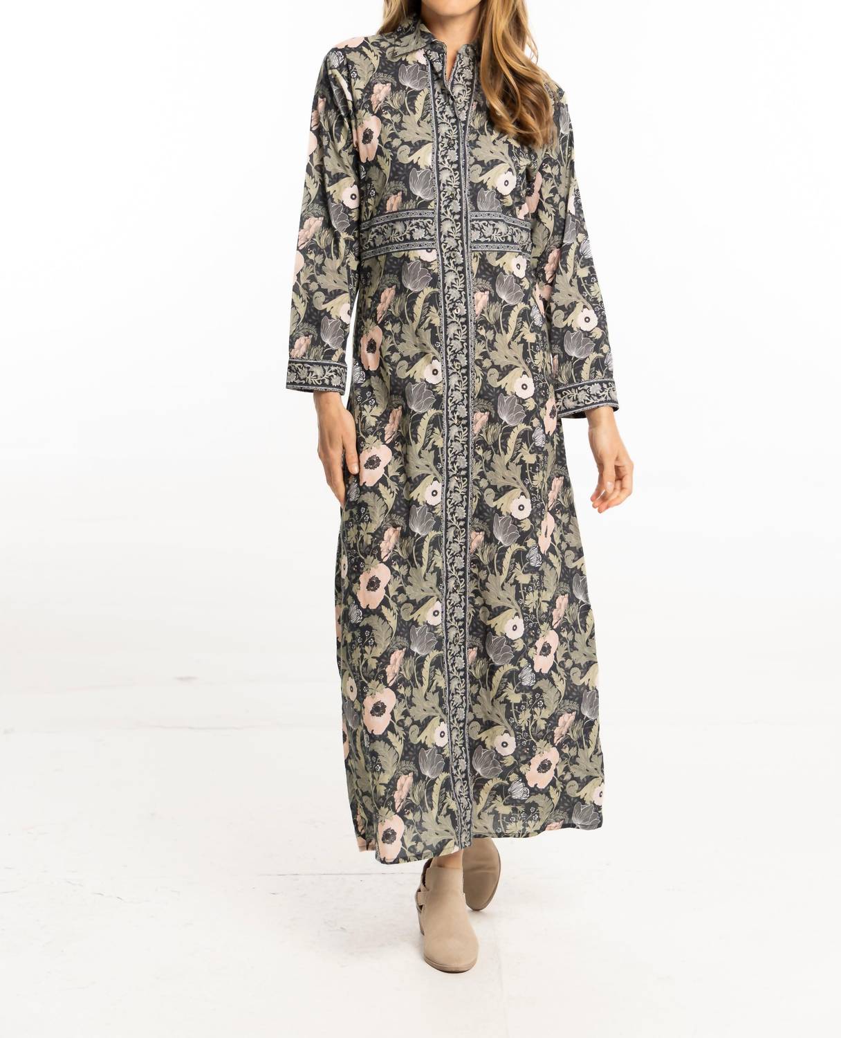 A maxi dress that is just as cute as it is comfortable. Celebrate fall in effortless elegance with the Sophie Maxi Dress by Bindu, designed in a chic moss hue. This boho chic, shift silhouette dress features long sleeves and a button closure, perfect for a playful yet sophisticated look. Crafted from soft cotton and adorned with a floral pattern, it offers warmth and grace for holiday parties, especially perfect for Thanksgiving gatherings. Embrace a stylish autumn look with this collared piece, beautifully capturing the essence of the season.