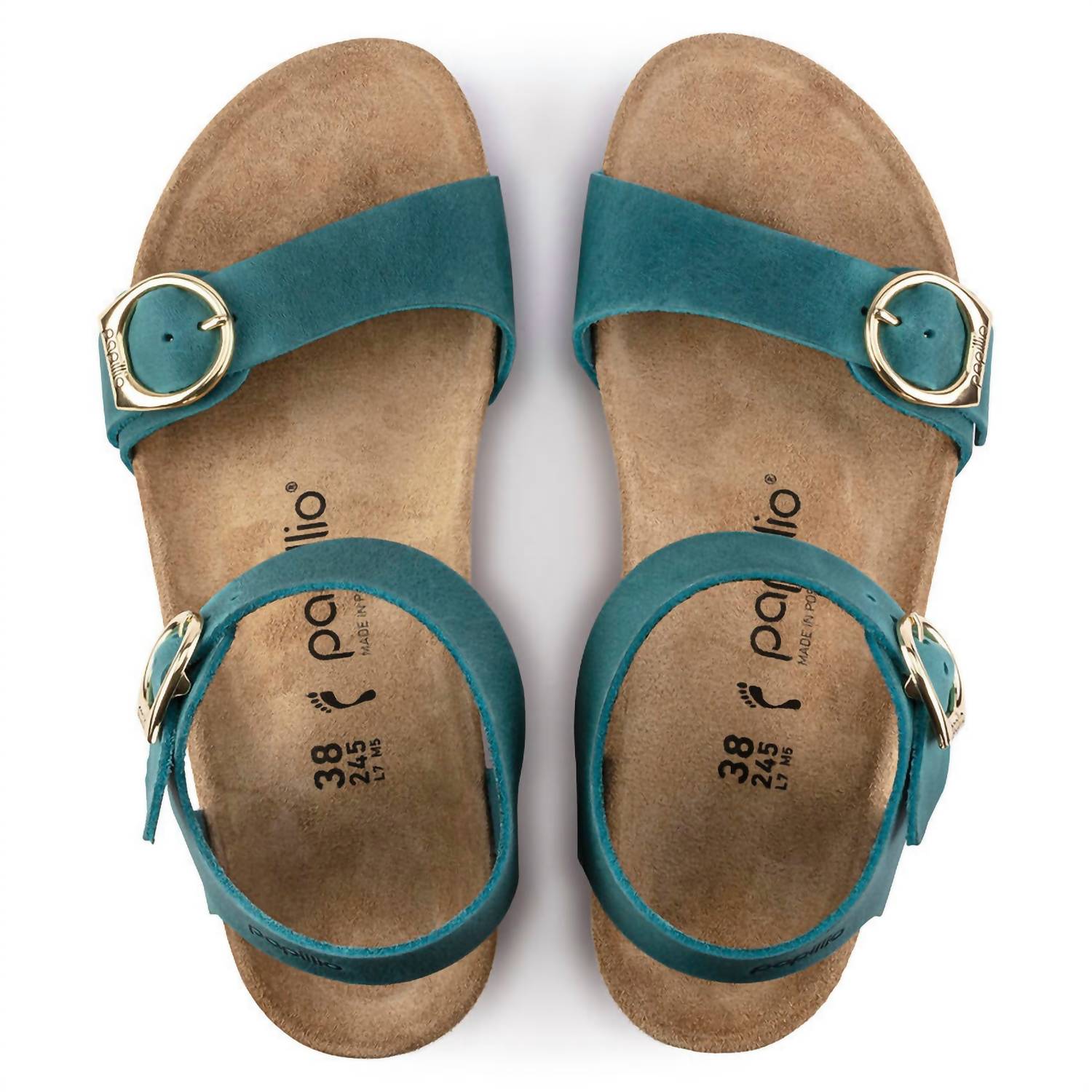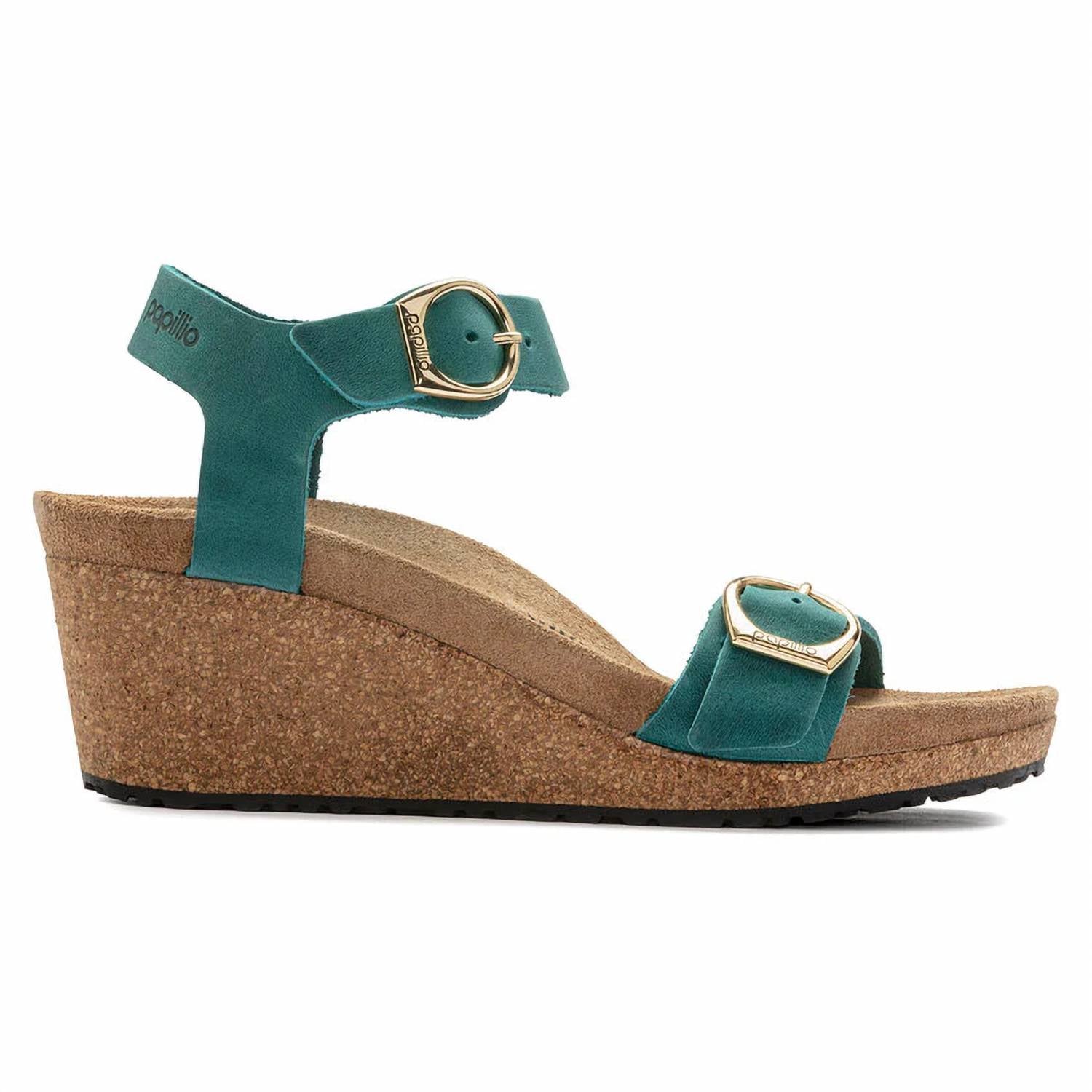 Entre em um estilo descomplicado com a Sandália Anabela Soley Ring-Buckle da BIRKENSTOCK, confeccionada em um deslumbrante tom verde-lago. Estas sandálias possuem cabedal em couro nobuck e palmilha de cortiça e látex com contornos que personalizam o suporte com o uso. Fabricadas em Portugal, apresentam duas fivelas de metal ajustáveis e um forro confortável em camurça. Com salto anabela baixo de 4 cm e sola de PU durável, estas sandálias garantem conforto e elegância atemporal para as mulheres.