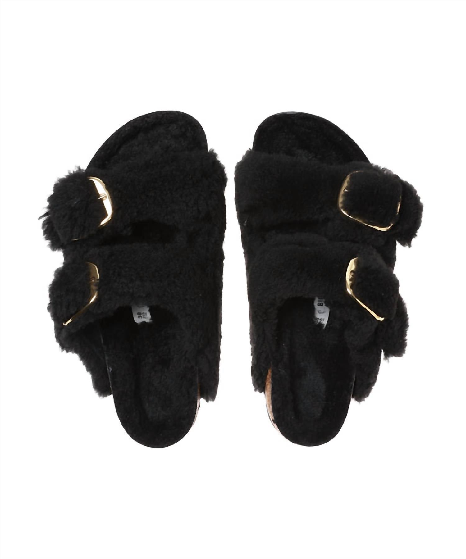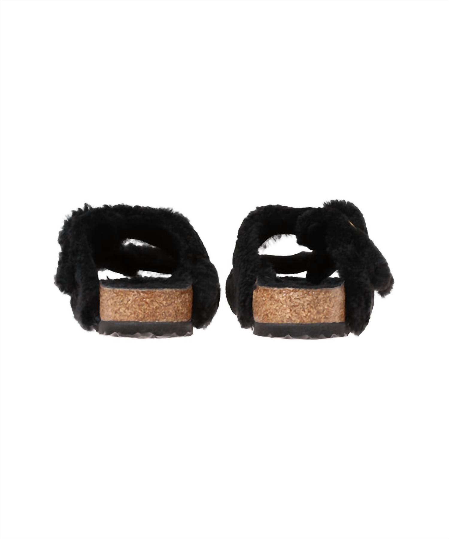 Contoured Cork-Latex Footbed for Custom Support. Plush Teddy Shearling Upper for a Cozy Look. Teddy Shearling Footbed Lining for Added Comfort. Lightweight and Flexible EVA Sole. Two Adjustable Straps with Oversized Metal Pin Buckles. Made in Germany Quality Stamp.