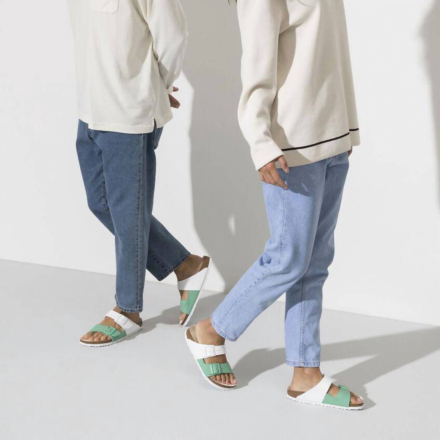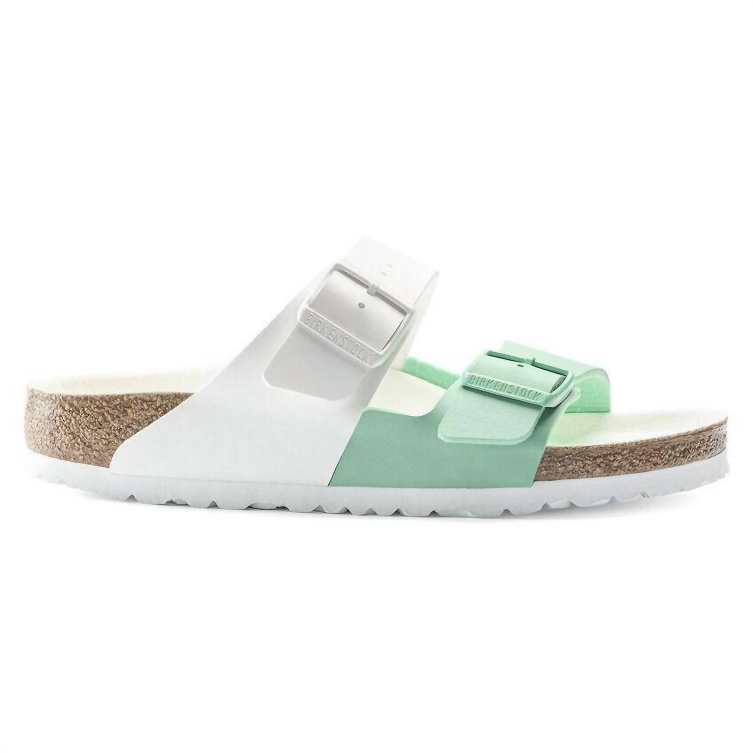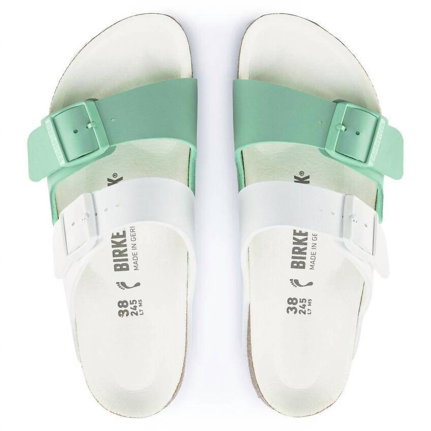 Rainboots so cute, you'll want to wear these even on the lightest drizzle days. Discover the BIRKENSTOCK Women's Arizona Split Sandals, a classic two-strap design offering both style and comfort. Crafted from durable Faux Leather in the striking White Bold Jade color, these sandals are perfect for a streetwear-inspired look. Featuring an open toe design and flat heel, they provide relaxed comfort all summer long. Ideal for travel and casual occasions.