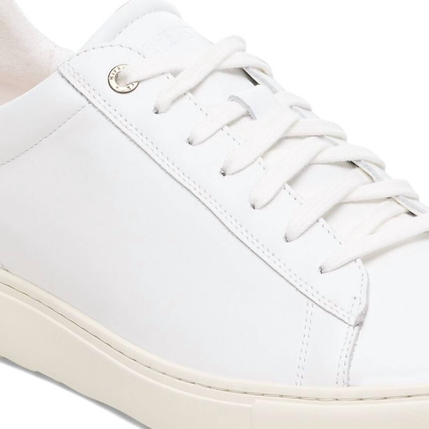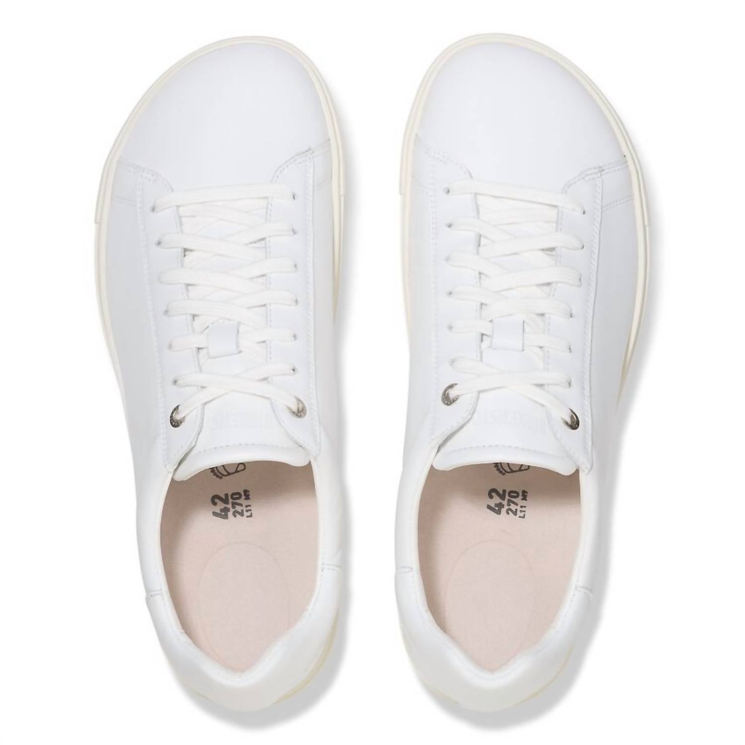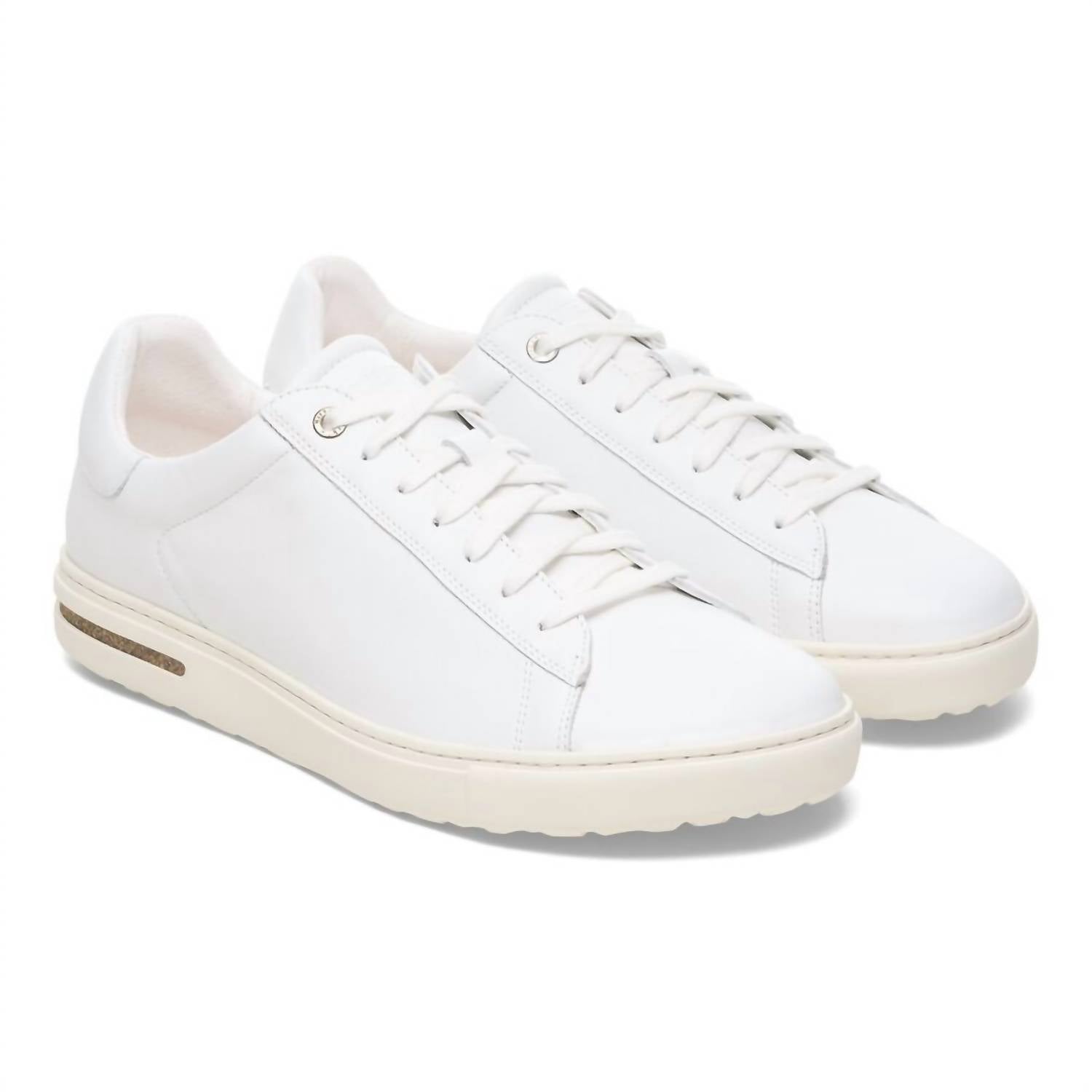 Embrace classic minimalism with the Birkenstock Women's Bend Low Leather Sneakers in White, a staple addition to any capsule wardrobe. Crafted with natural leather and a breathable microfiber lining, these sneakers offer comfort without sacrificing style. The removable, anatomically shaped cork-latex footbed, coupled with an extra cork insole, ensures optimal shock absorption for all-day wear. Made in Portugal, these flat sneakers feature a round toe and are perfect for spring travel or casual Fourth of July outings.
