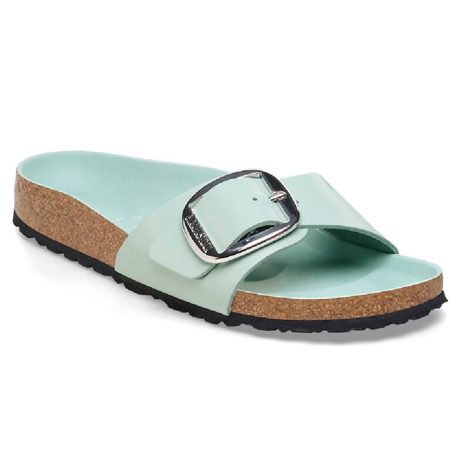 Esta sandália vai levar você do brunch ao jantar e a tudo o mais. Experimente a icônica sandália feminina Madrid Big Buckle da BIRKENSTOCK, uma combinação magistral de elegância e conforto na cor Surf Green. Confeccionada na Alemanha, esta sandália apresenta um design aberto com um impressionante detalhe de fivela grande e salto plano, com apenas 3,8 cm a 5 cm de altura. O cabedal em couro natural apresenta um acabamento de alto brilho, enquanto a palmilha semi-requintada em látex de cortiça e formato anatômico e o forro em couro piumato garantem um conforto excepcional. O solado em EVA completa esta sandália elegante e funcional, projetada para a mulher moderna.